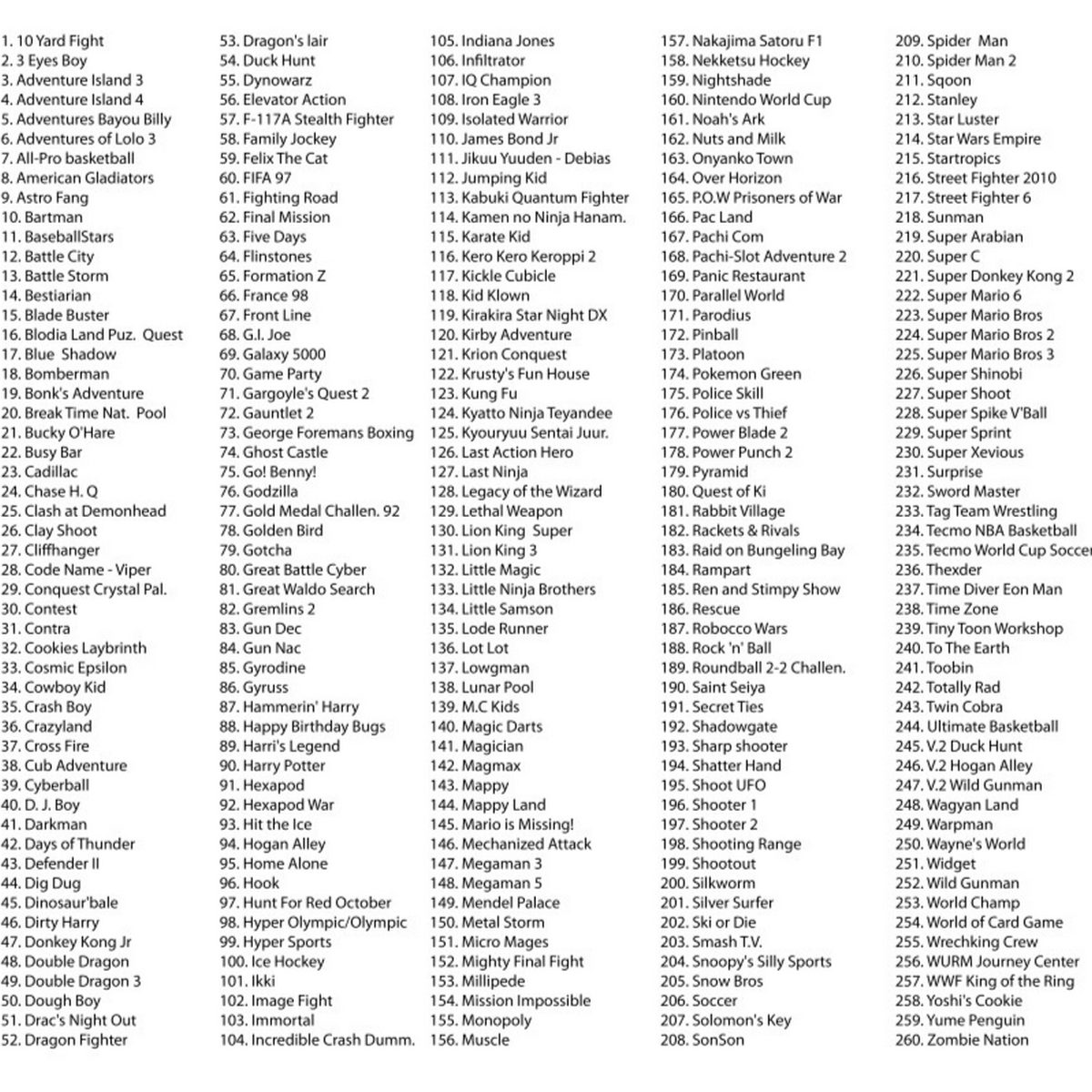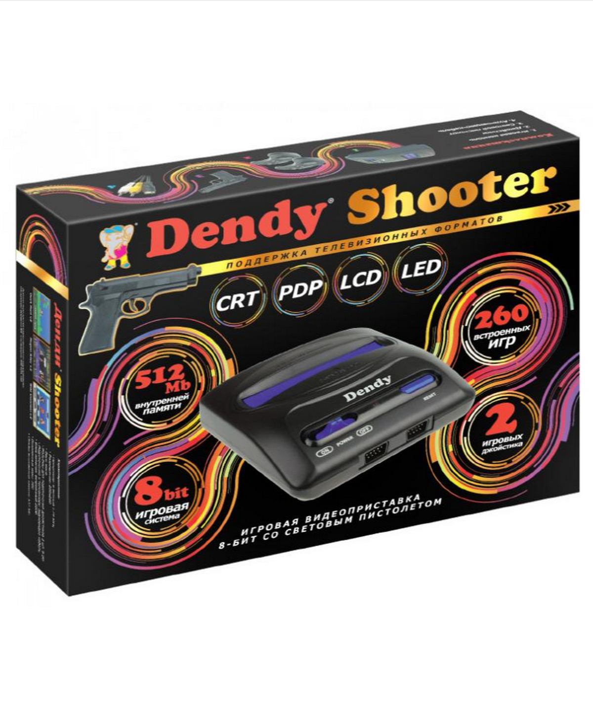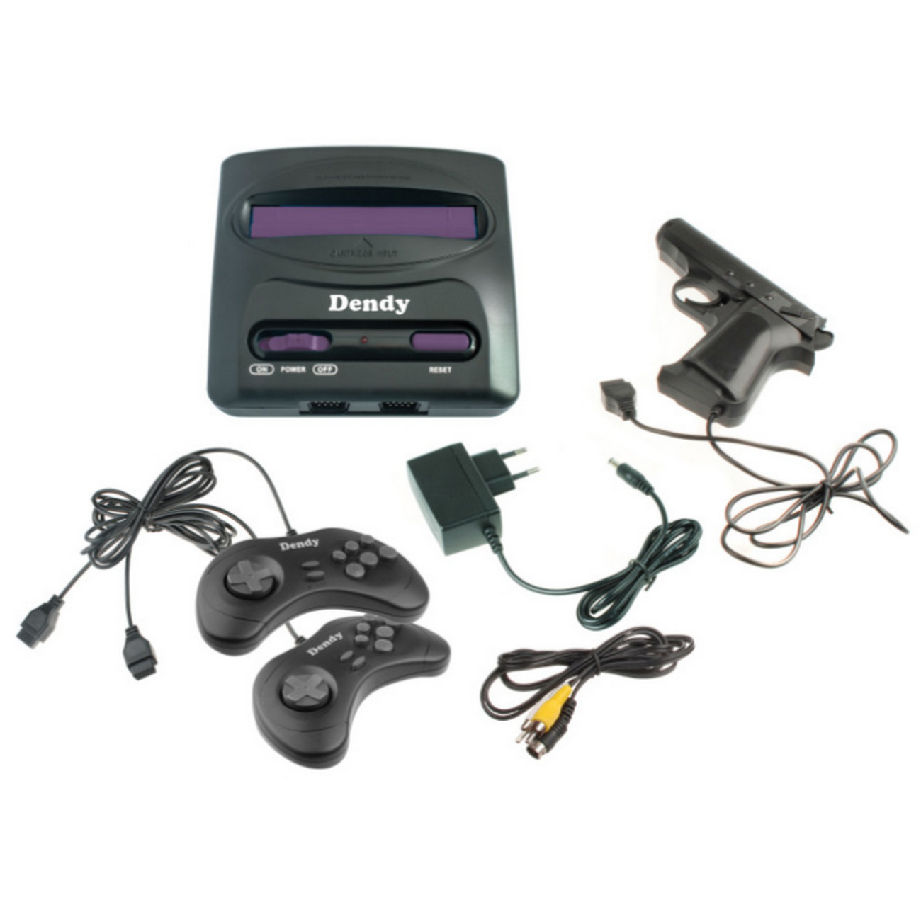 В сборник включены полные версии 260 увлекательных игр Денди и осталась возможность использовать стандартный картридж 8-бит. Игровая приставка комплектуется полнофункциональными джойстиками усиленной конструкции, кнопки START и MODE выполнены из прорезиненного материала.