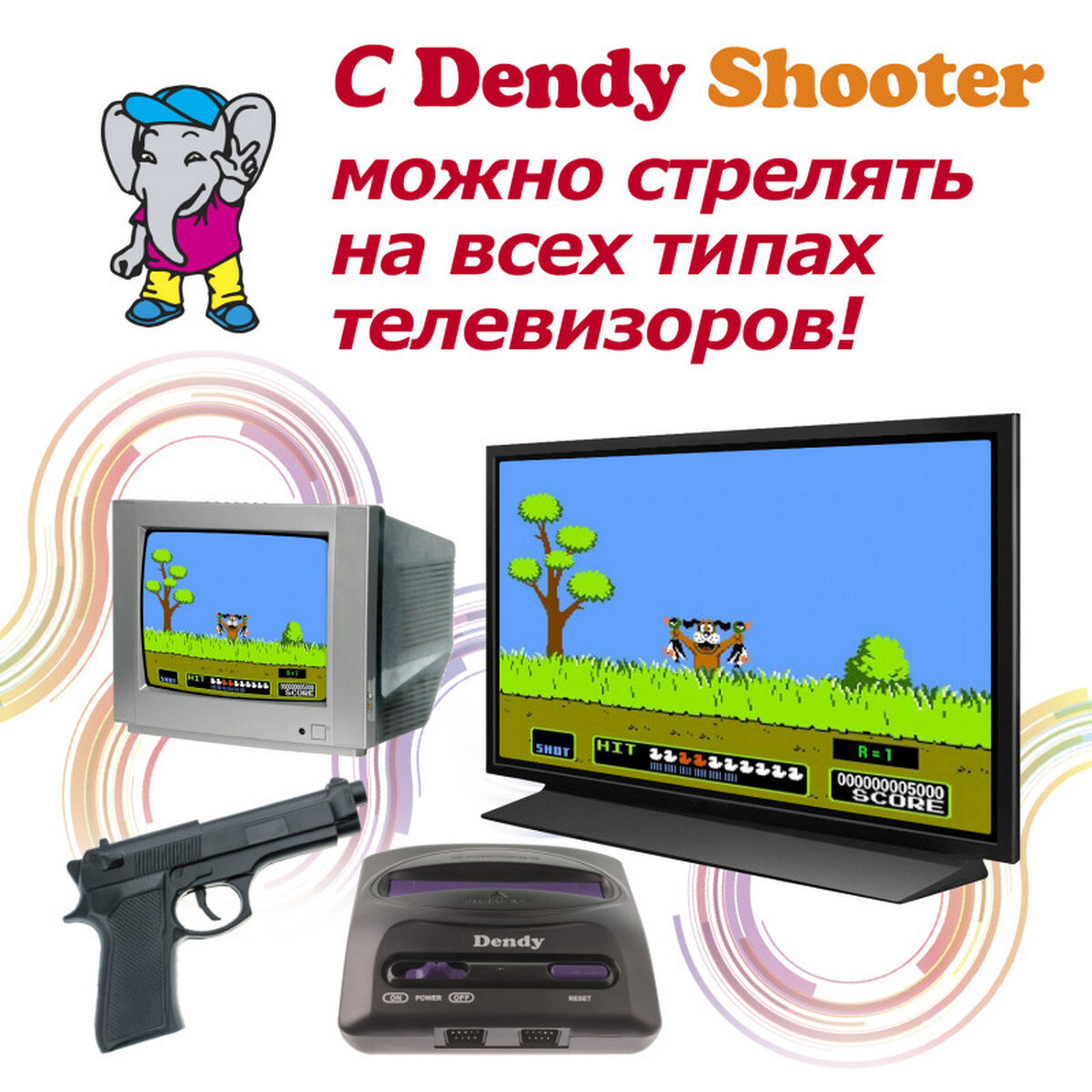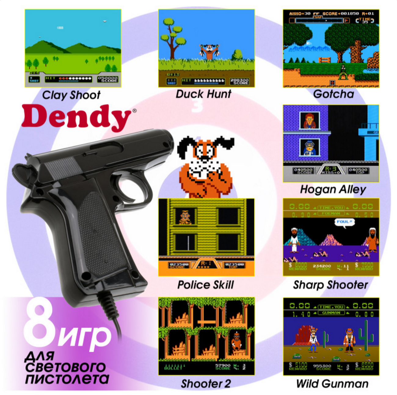 В Dendy Shooter реализована совместимость светового пистолета и современных телевизоров стандартов LCD, LED и PDP. Именно для работы на этих телевизорах модернизированы 3 игры: V.2 Duck Hunt, V.2 Hogan Alley и V.2 Wild Gunman. Также в приставке сохранена совместимость игр для светового пистолета и телевизоров стандарта CRT (ЭЛТ).