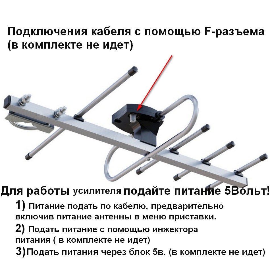 Питание можно подать по кабелю через приставку "включить питание антенны" или через инжектор питания или блок питания для антенн 5вольт (приобретается отдельно)