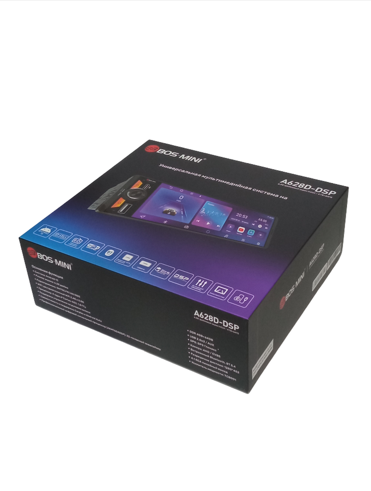 Автомагнитола BOS‑MINI BOSA628D‑DSP (1DIN, экран 6,28″) на базе Android с 4 ГБ оперативной и 64 ГБ встроенной памяти — многофункциональный мультимедийный центр для автомобиля. Оснащена сенсорным HD‑дисплеем (1280 × 452), двухдиапазонным Wi‑Fi (2,4 ГГц и 5 ГГц), Bluetooth 5,4 и встроенным DSP‑процессором для тонкой настройки звука (32‑полосный эквалайзер). Поддерживает Android 113, Google Play, CarPlay и Android Auto, позволяет устанавливать навигационные приложения (Яндекс Навигатор, Google Maps) и медиаплееры. Воспроизводит аудио (MP3, WMA, FLAC и др.) и видео (AVI, MKV, MP4 и др.), имеет два USB‑порта, вход AUX, разъёмы RCA и для камеры заднего вида.