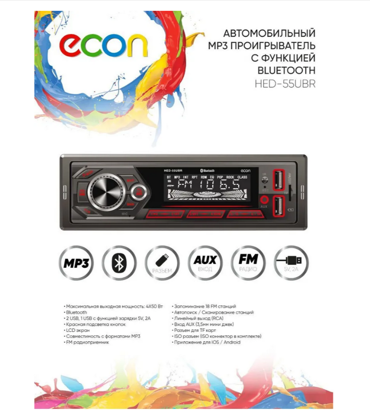 Автомобильный бездисковый ресивер ECON HED-55UBR с поддержкой Bluetooth.