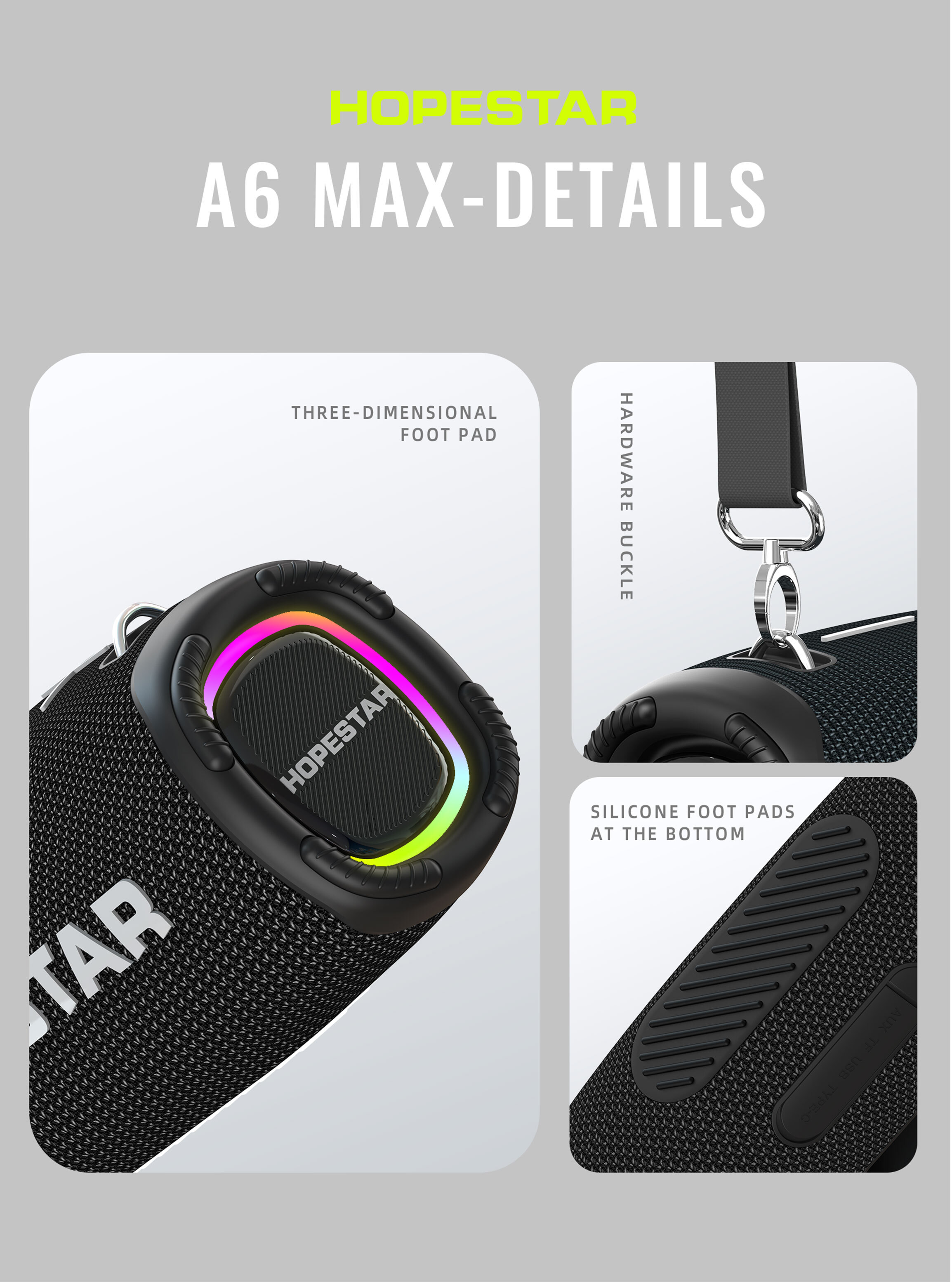 Hopestar A6 MAX — мощная портативная колонка с суммарной выходной мощностью 80 Вт и технологией Bass Boost для насыщенных низких частот. Идеальное решение для вечеринок, домашнего использования и активного отдыха: сочетает впечатляющий звук, современный дизайн и функциональность.