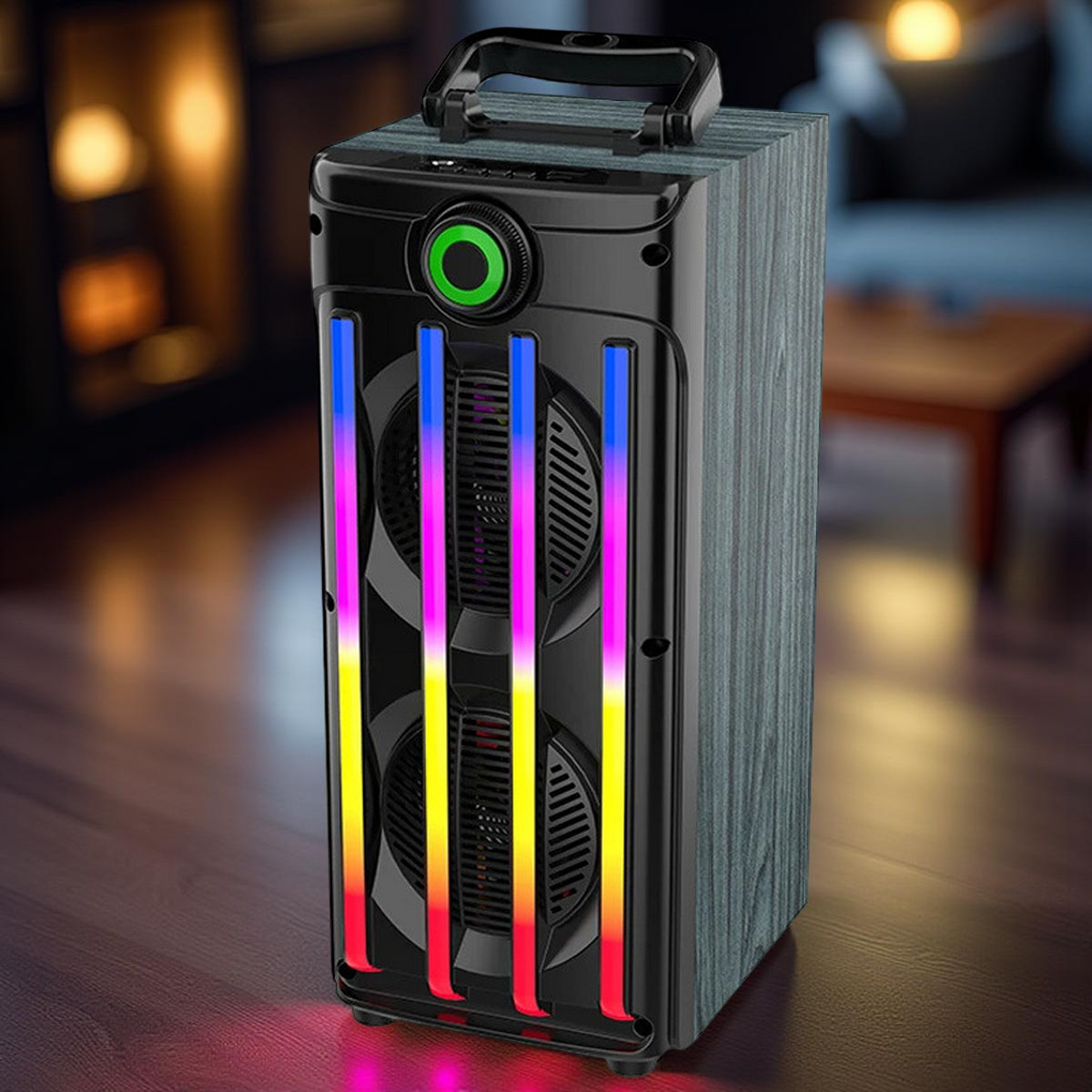Мощная беспроводная колонка JQS‑9401 с функцией караоке превратит любой вечер в профессиональную вокальную площадку. Устройство сочетает насыщенный бас, качественную обработку голоса и эффектную RGB‑подсветку — идеальное решение для домашних вечеринок, праздников и дружеских посиделок.