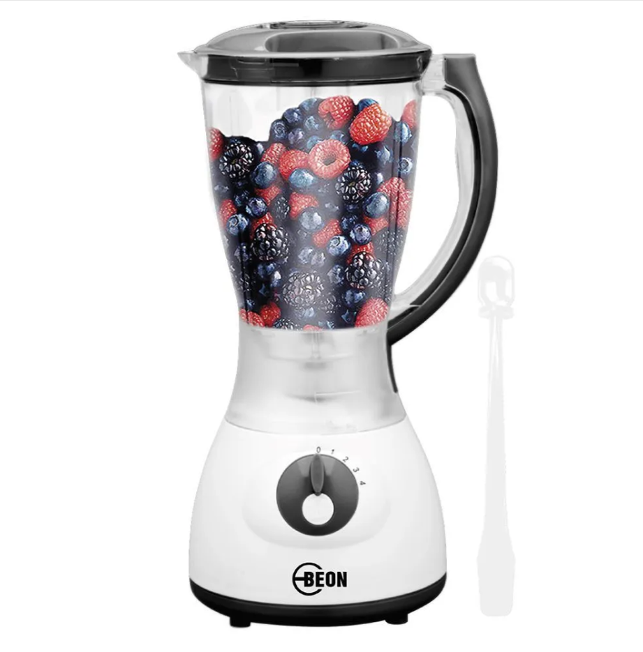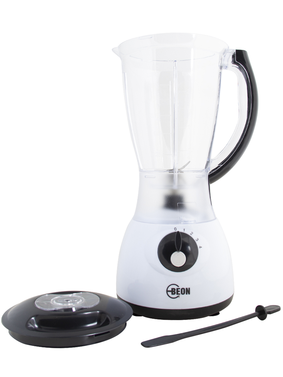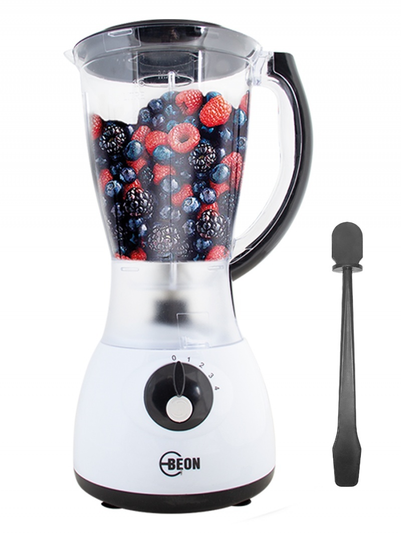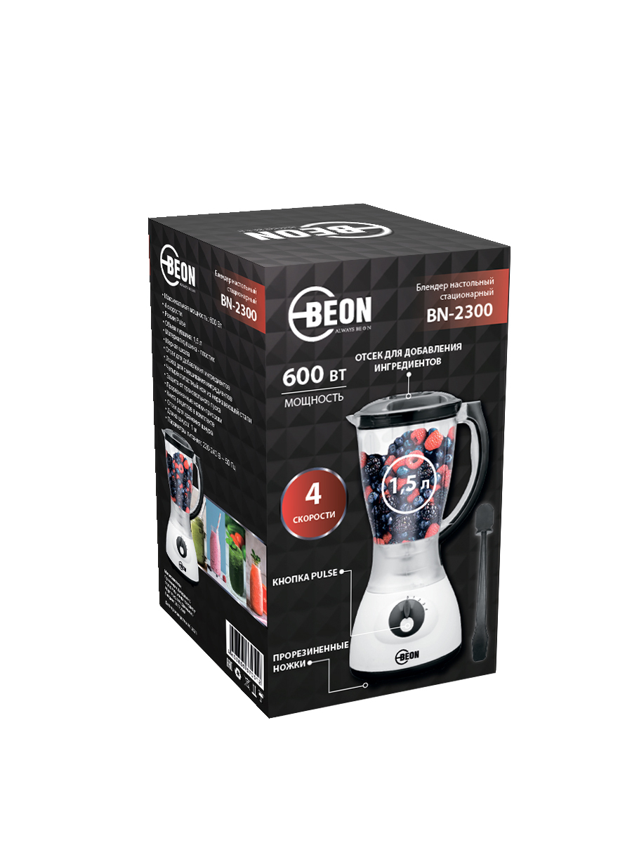 Стационарный блендер Beon BN-2300 оснащен четырехлопастным ножом, произведенным из качественной нержавеющей стали. Для удобства эксплуатации в крышке устройства есть специальное отверстие для добавления дополнительных ингредиентов в процессе готовки. Управление режимами стационарного блендера Beon BN-2300 осуществляется с помощью переключателя, расположенного на передней части корпуса. Прорезиненные ножки-присоски обеспечивают надежную фиксацию модели на столе, предотвращая возможное падение. В комплекте с устройством поставляется специальная ложка с удлиненной ручкой, с помощью которой удобно перемешивать ингредиенты в кувшине.