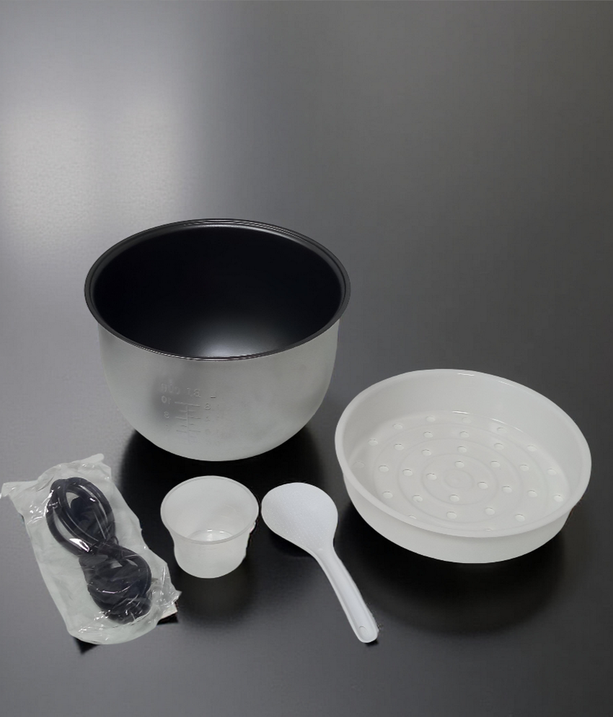 Набор для мультиварки: Внутренняя чаша 5 литров 24 х 14 см, ложка, мерный стаканчик, контейнер-пароварка 22,5 х 20,5 см (внутренний диаметр) х 4,5 см, кабель питания.