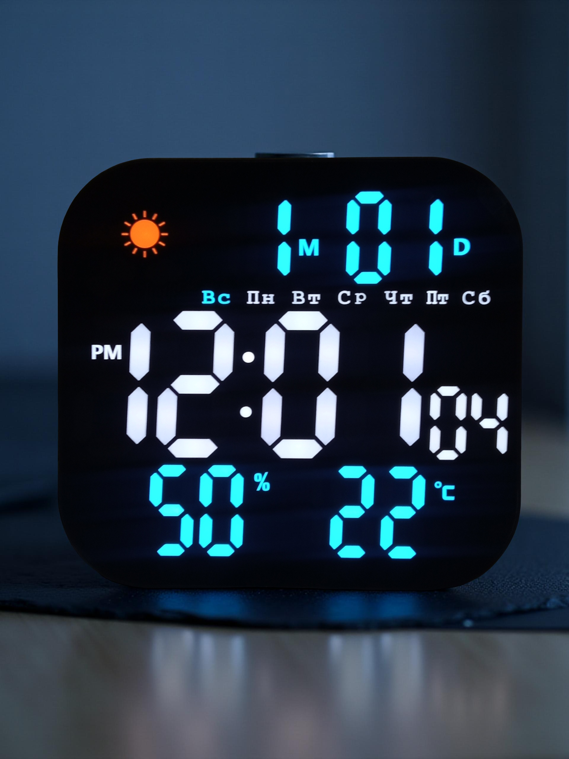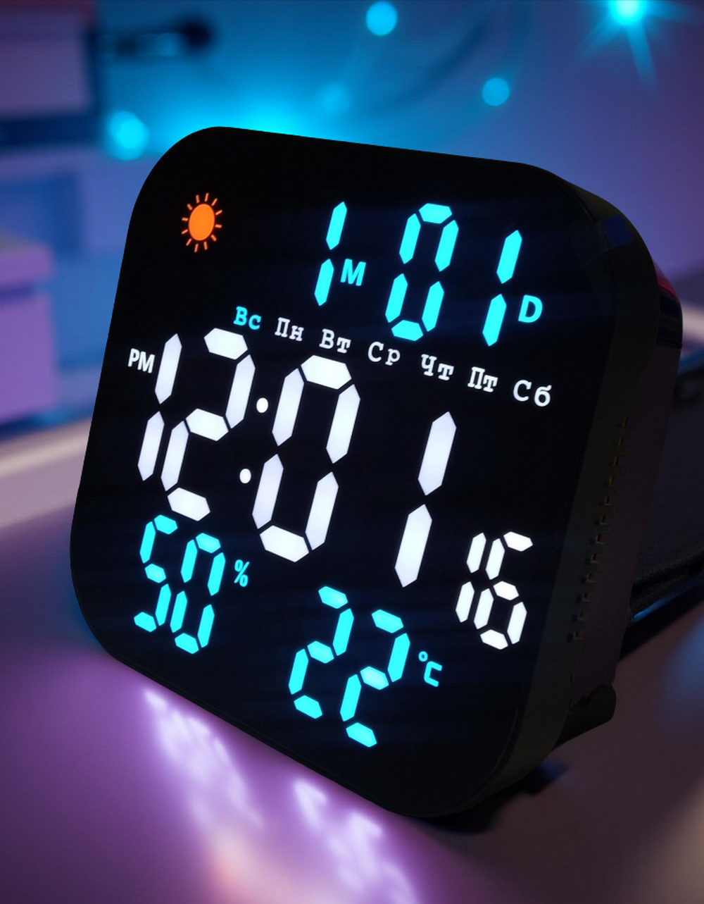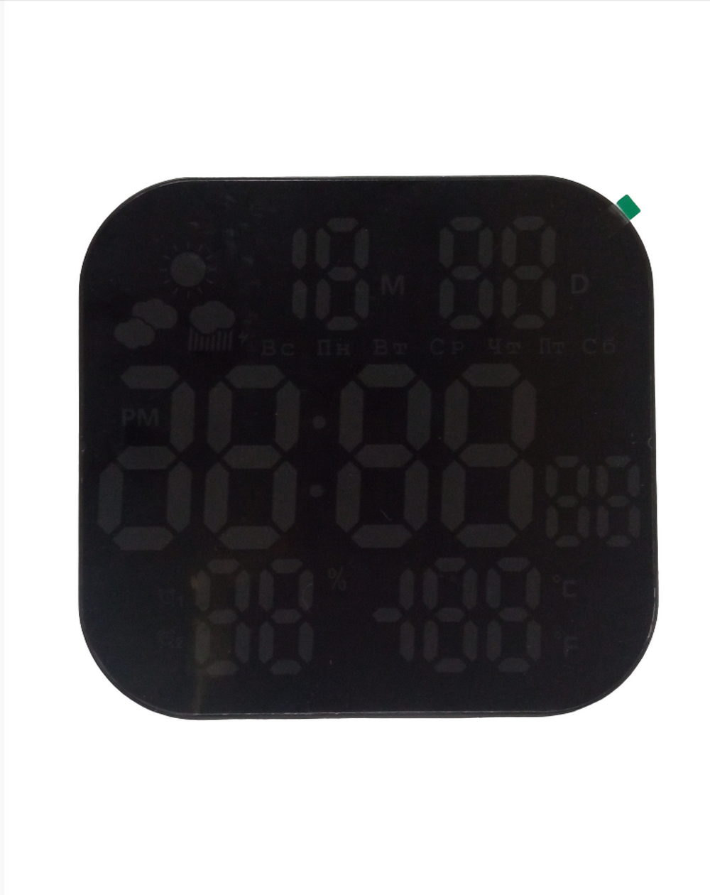 Светодиодная индикация времени, даты, температуры, влажности, недели (двухцветная) и погоды.