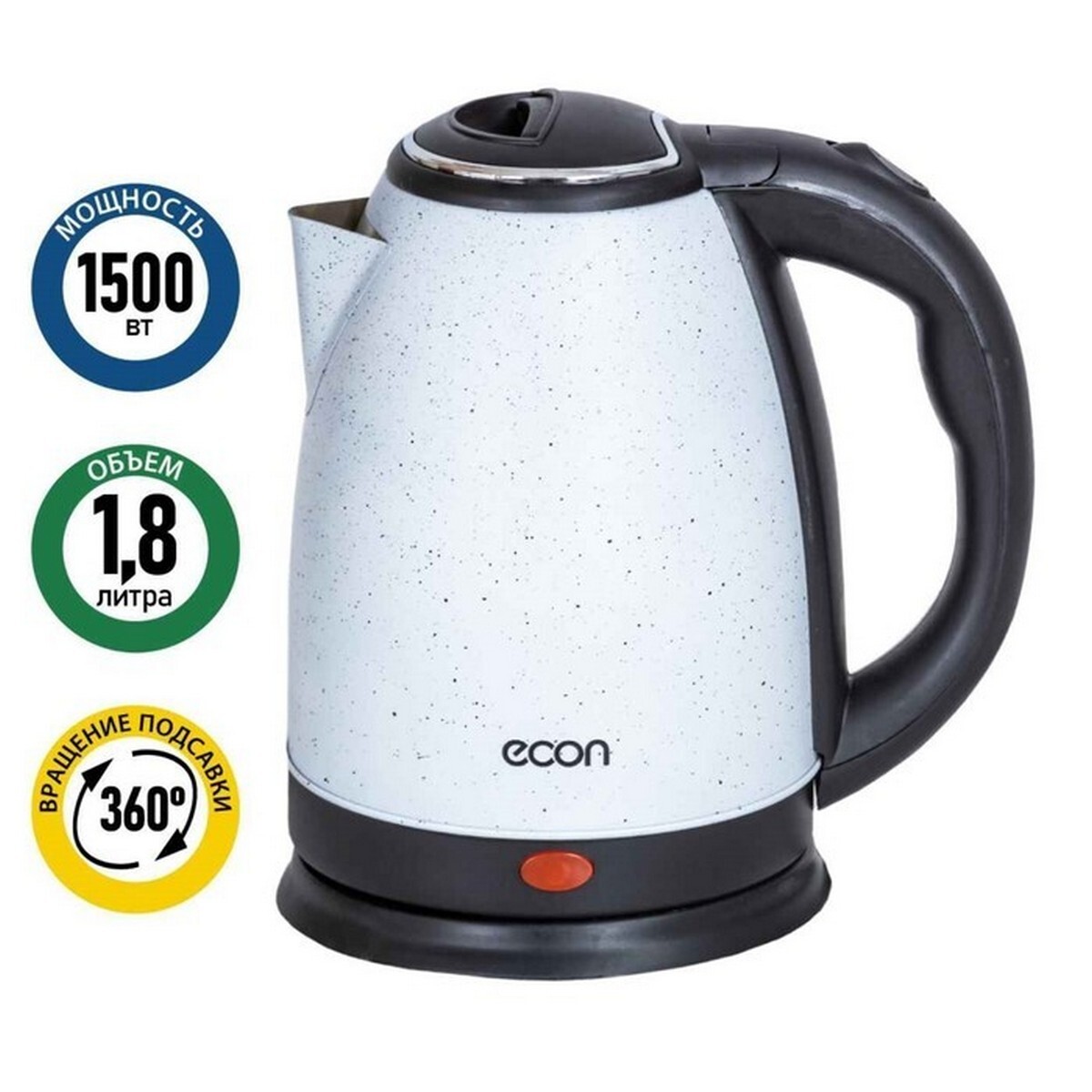 Электрочайник ECON ECO-1890KE мощностью 1500 Вт и объемом 1.8 л выполнен в корпусе из нержавеющей стали с мраморным покрытием. Прибор выключается автоматически при закипании и недостаточном уровне воды в колбе, что обеспечивает дополнительную безопасность в использовании. Характеристики: