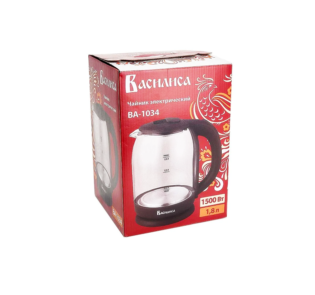 Чайник Василиса BA-1034 стекло Параметры Объем 1,8 л Номинальная потребляемая мощность 1500 Вт Описание Корпус из высококачественного термостойкого стекла Закрытый нагревательный элемент из нержавеющей стали Вращение корпуса на 360° Цвет: черный Шкала уровня воды Внутренняя LED-подсветка Отсек для хранения электрошнура Автоматическое отключение при закипании Блокировка включения без воды Комплектация: Чайник-1шт. Подставка-1шт. Упаковка: цветная коробка