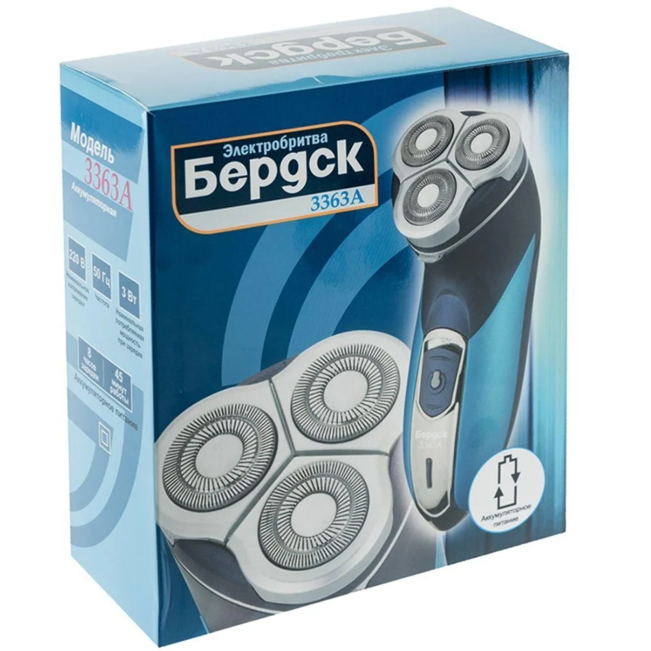 Эл. Бритва Бердск 3363A вухдорожечные ножи (увеличивают интенсивность бритья за счет большей площади) Выдвижной стригущий блок для подравнивания висков и усов Система объемного бритья (более качественное бритье за счет повторения контура лица) Плавающие бреющие головки Подвижные сектора бреющего блока Аккумуляторное питание Номинальное напряжение зарядки 220 В Частота 50 Гц Номинальная потребляемая мощность при зарядке 3 Вт 8 часов зарядки 15 минут работы