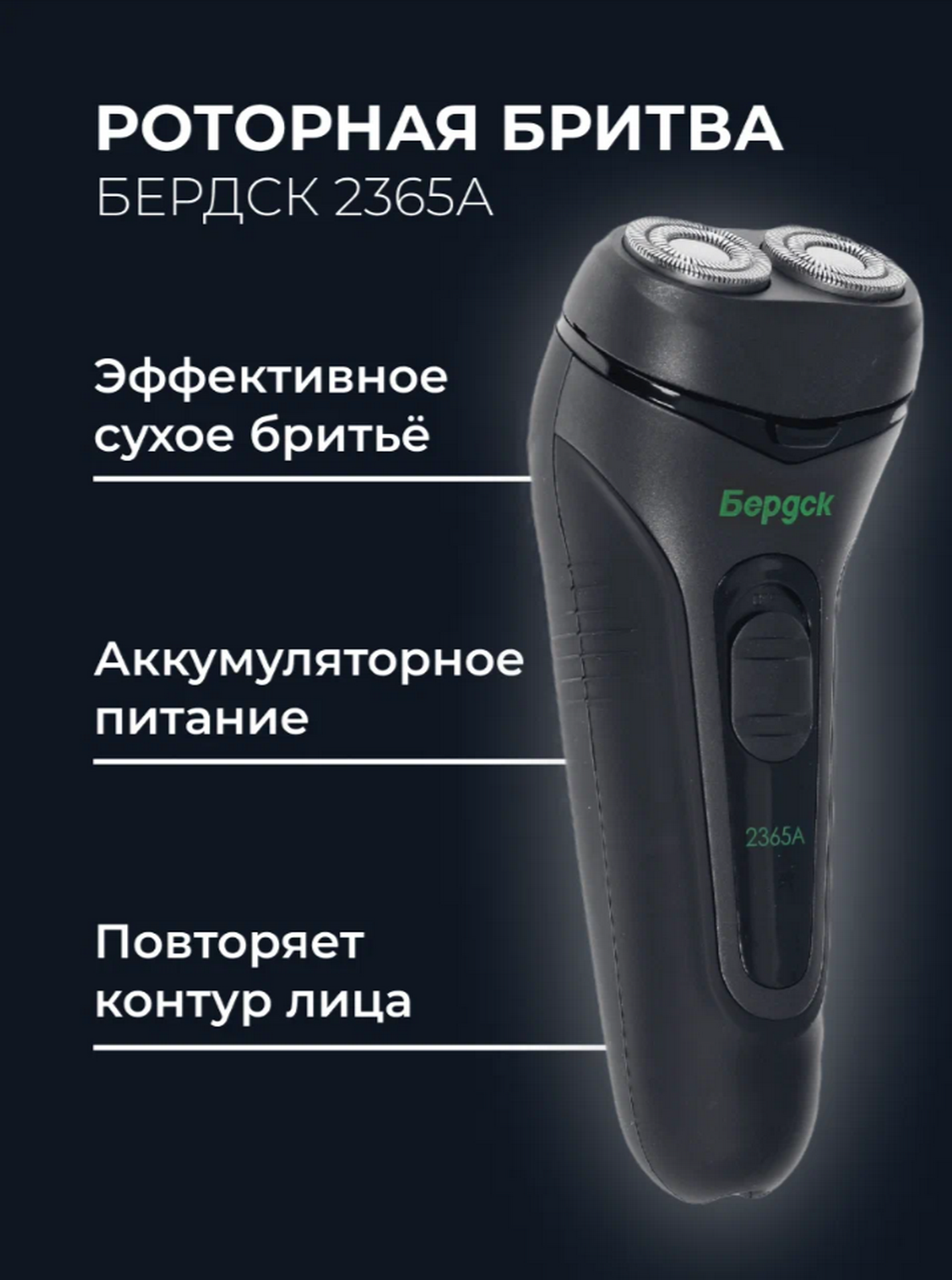 Электробритва Бердск 2365A - это роторная бритва с двумя бреющими элементами. Она предназначена для сухого бритья и оснащена плавающими головками, которые повторяют контуры лица. Это обеспечивает комфортное бритье и минимизирует риск порезов и раздражения кожи.