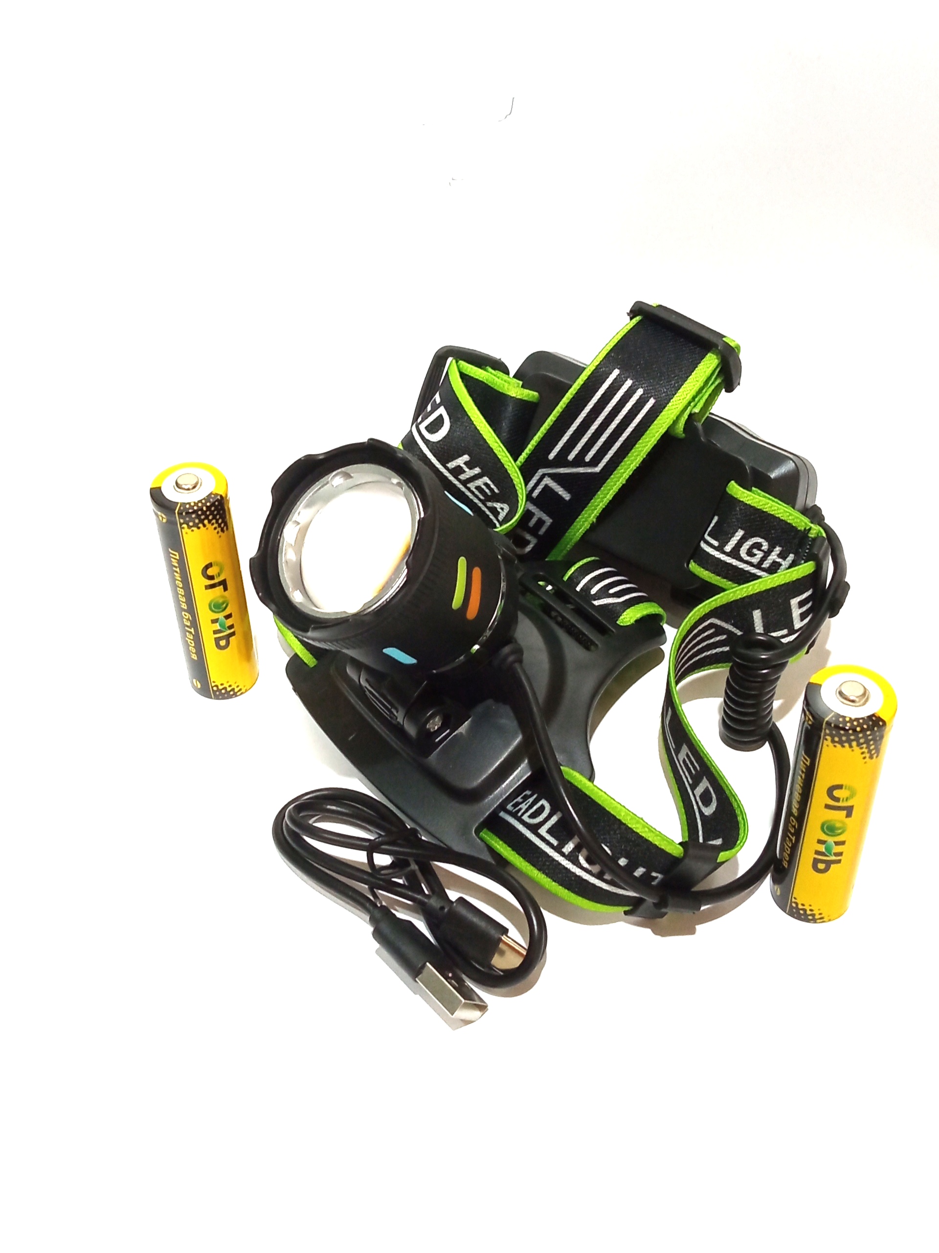В комплект входят: фонарь, эластичный ремень, 2 аккумулятора 18650. Кабель зарядки.