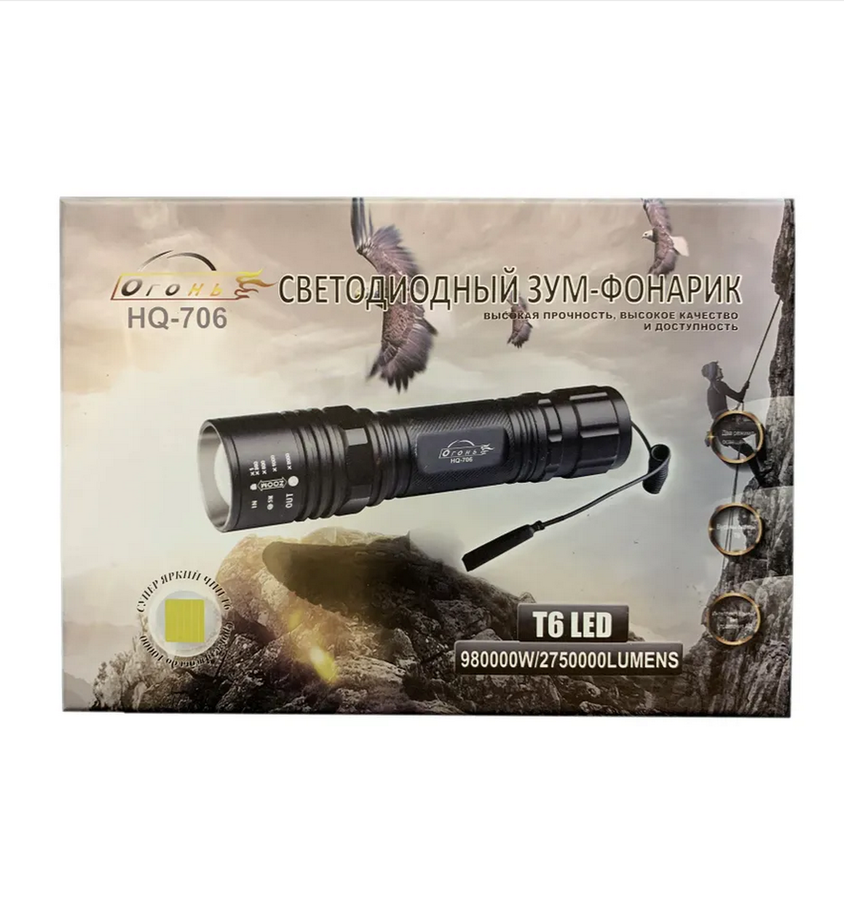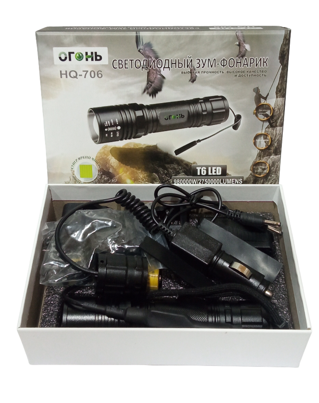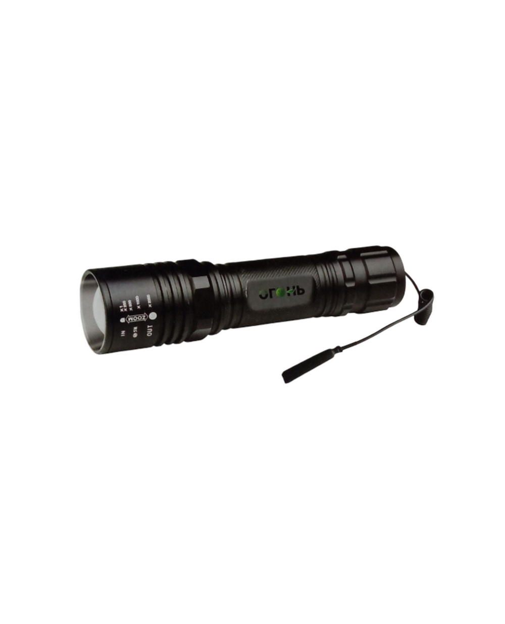 Ручной фонарь «Огонь» с LED‑диодом T6 — мощный и компактный источник света со световым потоком до 1 000 люмен и дальностью свечения до 300 м в режиме сфокусированного луча. Оснащён функцией Zoom для регулировки ширины светового потока, работает в одном ярком режиме. Корпус из анодированного алюминия ударопрочный и влагозащищённый (соответствует стандарту защиты от внешних воздействий). Питание — от литий‑ионного аккумулятора 18650 (5 200 мАч, в комплекте), время непрерывной работы — до 12,5 часов. В набор входят: зарядное устройство от сети 220 В, зарядное устройство от автомобильного прикуривателя, тактическая кнопка управления и крепление.