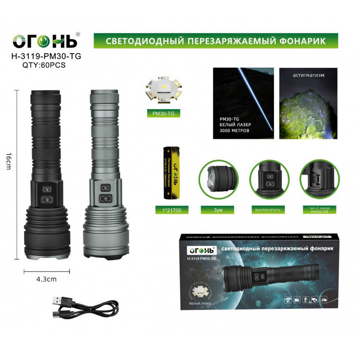 Фонарь ручной высокой яркости «белый лазер» Огонь H‑3119‑PM30‑TG — мощный портативный осветитель с передовым лазерным диодом PM30‑TG, обеспечивающим сверхъяркий концентрированный луч дальностью до 500 м и световым потоком до 3000 люмен. Устройство поддерживает 5 режимов работы: высокая/средняя/низкая яркость, стробоскоп и SOS — для любых сценариев использования. Корпус из ударопрочного авиационного алюминия защищён по стандарту IP68 от воды, пыли и механических повреждений, выдерживает падения и экстремальные температуры. Функция Zoom позволяет плавно регулировать толщину луча — от точечного до рассеянного освещения. Для удобства оснащён индикатором уровня заряда и разъёмом USB Type‑C для быстрой зарядки; также может выступать в роли Power Bank для подзарядки гаджетов. В комплект входят аккумулятор 21700, кабель Type‑C и ремешок на запястье. Идеален для туризма, охоты, аварийно‑спасательных работ и повседневного применения.