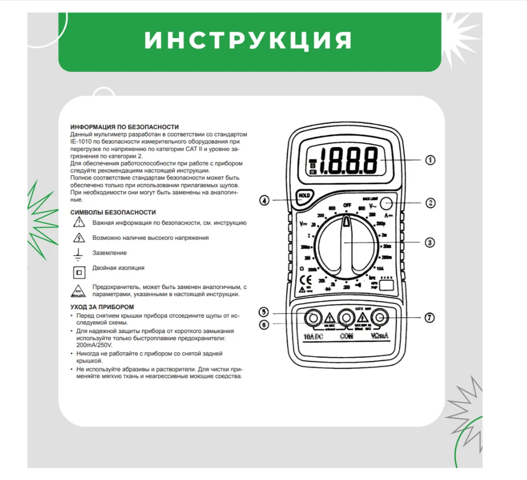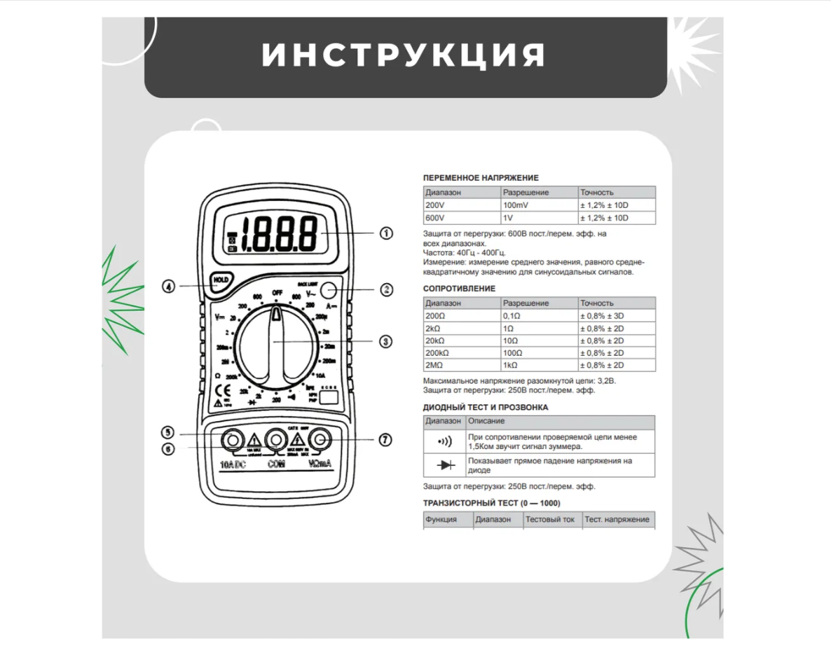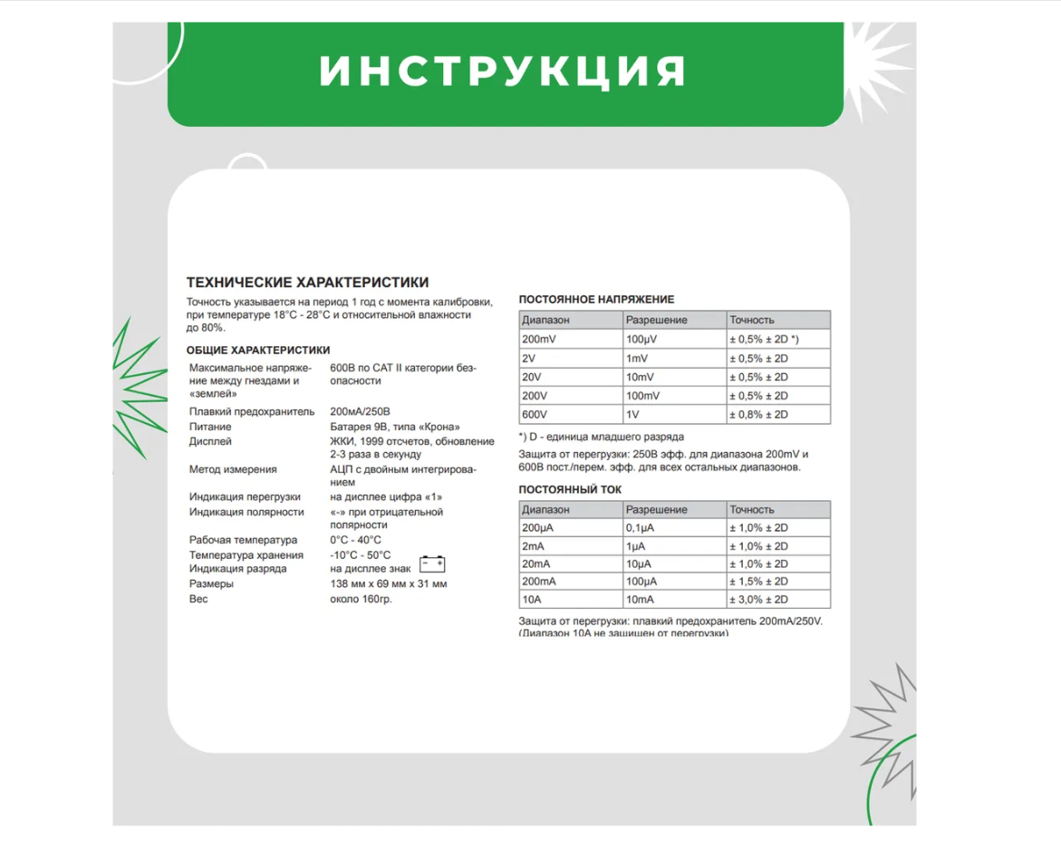 Благодаря функции DATA HOLD можно зафиксировать только что измеренное значение на дисплее. Прибор совершает 2-3 измерения в секунду. Компактные размеры и малый вес способствуют комфортной работе пользователя. Min переменное напряжение