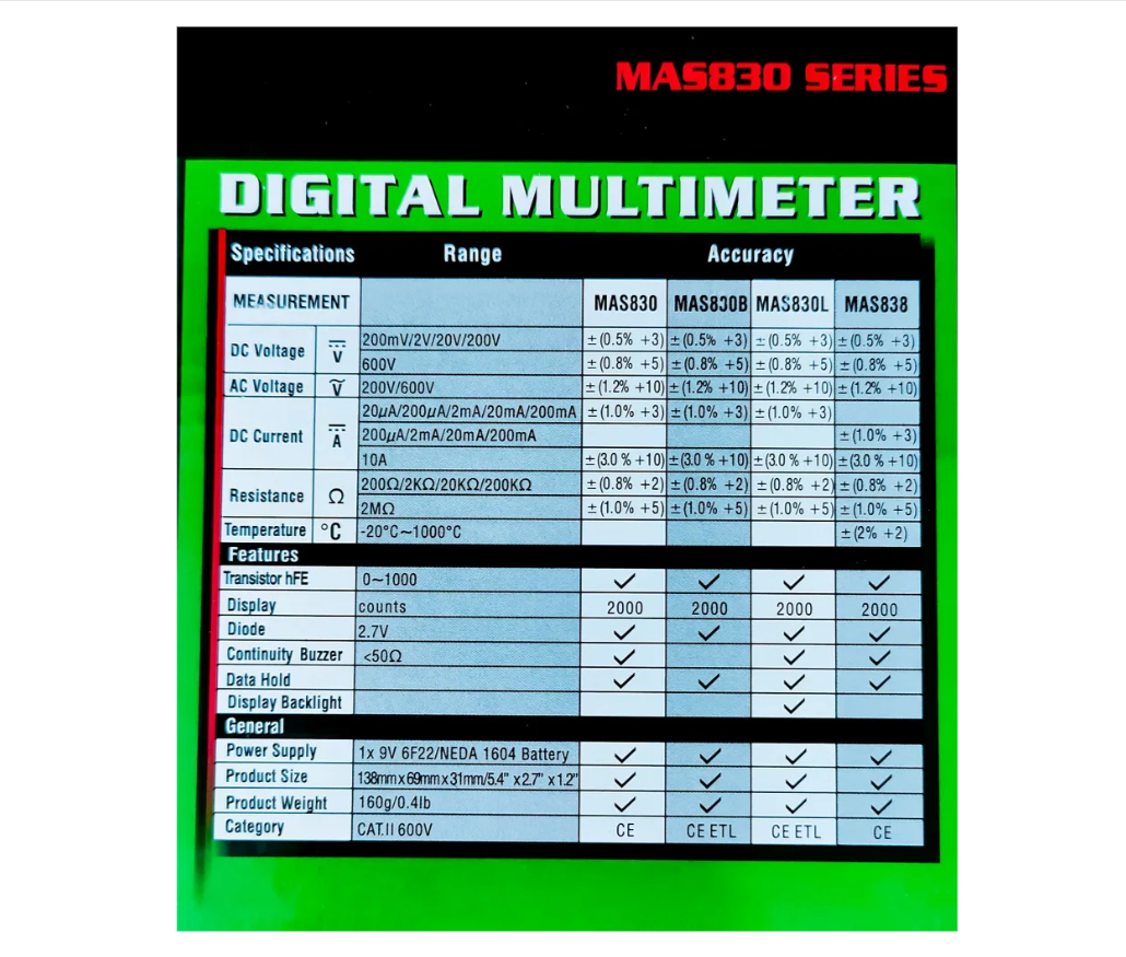 Цифровой мультиметр MAS830L позволяет измерять силу постоянного и переменного электротока, определять показатели напряжения, сопротивления, индекс усиления биполярных транзисторов. Данное устройство, в отличие от своего собрата 830 B, имеет встроенную функцию звуковой прозвонки.