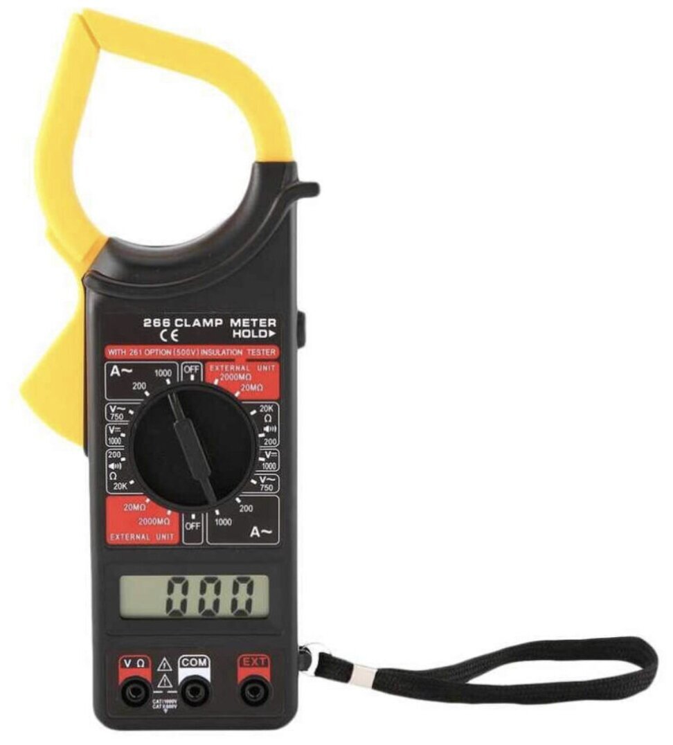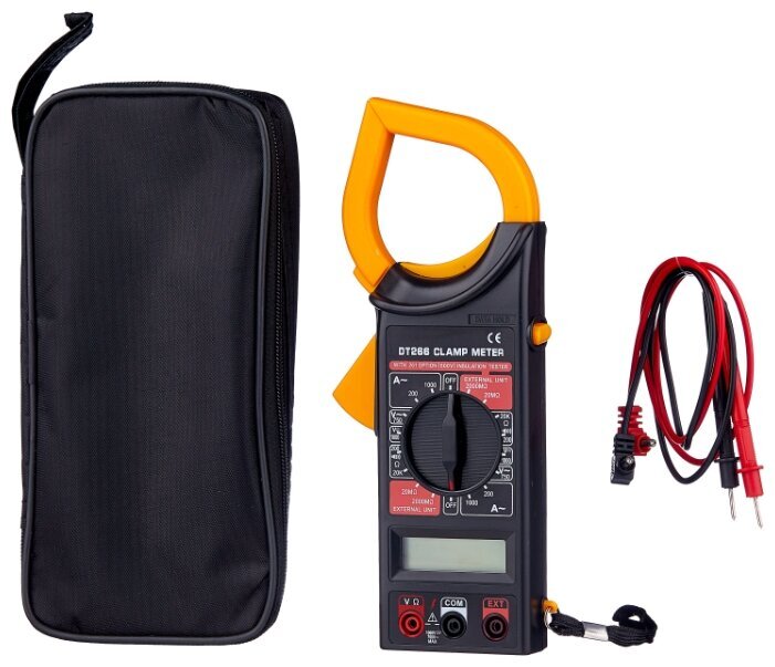 Мультиметр DT-266 (клещи) являются портативным, цифровым электроизмерительным прибором. Изделие применяется в случае необходимости измерения величин температуры (с помощью термопары в комплекте) постоянного и переменного напряжения (одно- / трех- фазного), переменного тока, сопротивления, прозвонки соединений и определения разрыва электроцепи. Корпус выполнен из противоударного пластика и оснащен малогабаритными клещами трансформатора, гашеткой, жидкокристаллическим дисплеем и несколькими входами для подключения щупов. Есть удобная сумка-чехол. Техническая спецификация Постоянное напряжение: 1000В Переменное напряжение: 750В. Переменный ток: 200/1000А. Проверка изоляции: 20/2000МОм. Сопротивление: 200Ом, 20кОм Частота: 2кГц.
