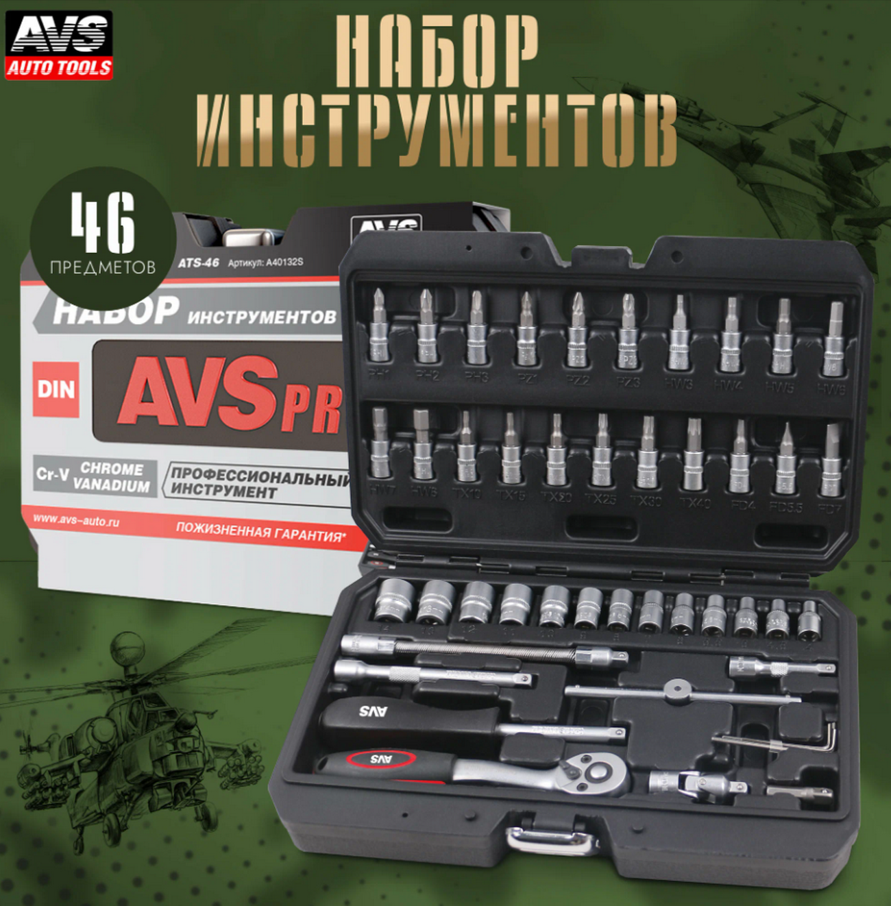 Набор инструментов AVS Tools ATS-46 в комплектации из 46 предметов, упакованных в кейс для надежного хранения и безопасной транспортировки.