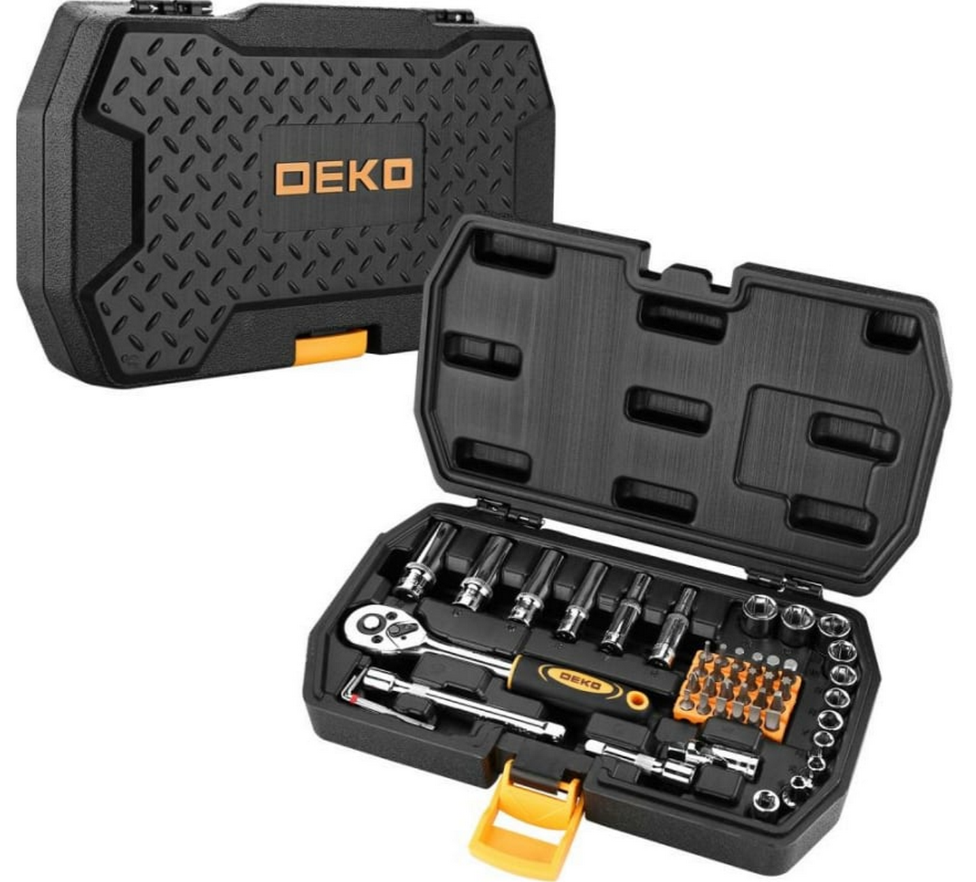 Набор инструментов для автомобиля DEKO DKMT49 в чемодане включает в состав оборудование, выполненное из высокопрочной стали, которая прошла дополнительную закалку и специальную обработку. Это защищает инструмент от коррозии, а также делает его более устойчив к любым физическим деформациям.