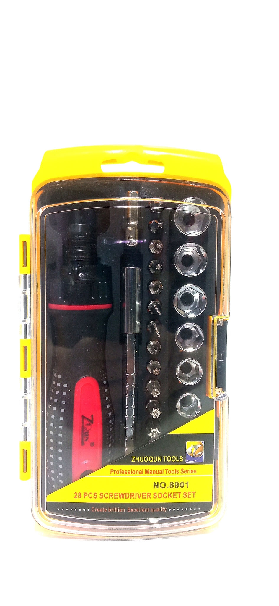 Отвертка реверсивная с битодержателем ,комплектом бит и головок (28пр.) в пластиковом футляре.