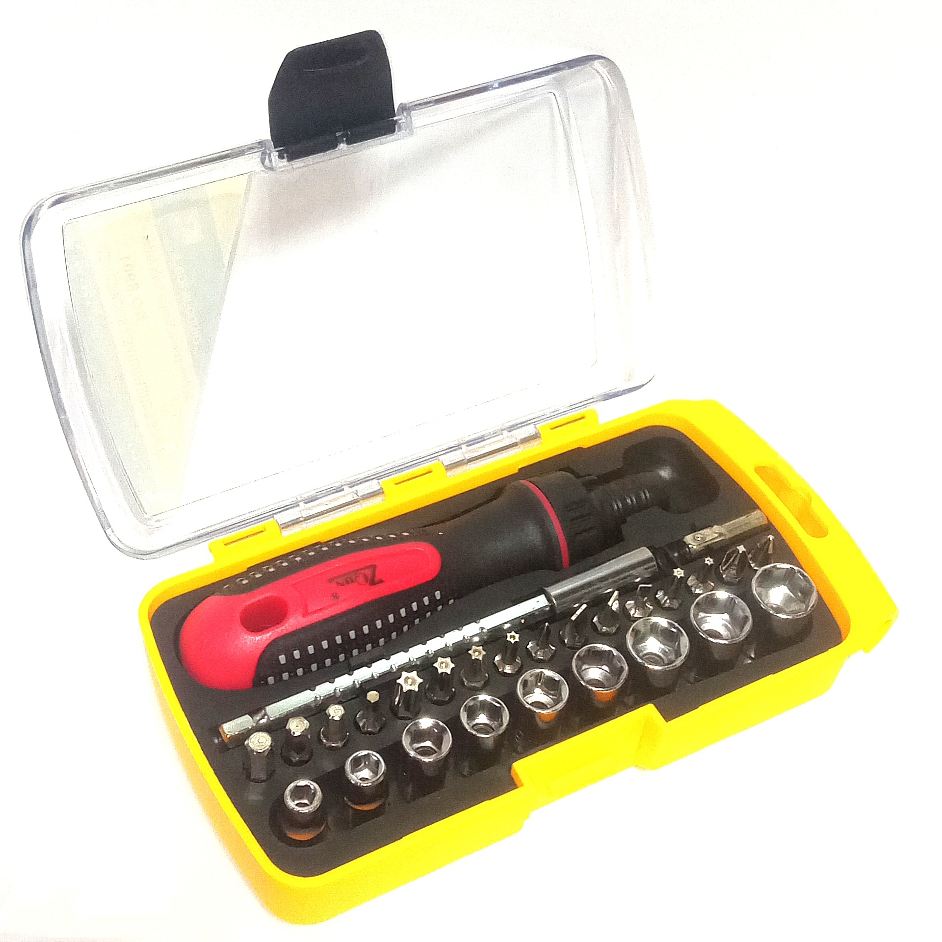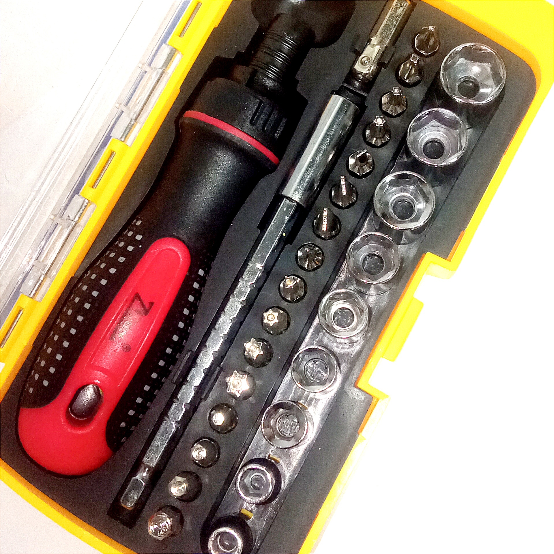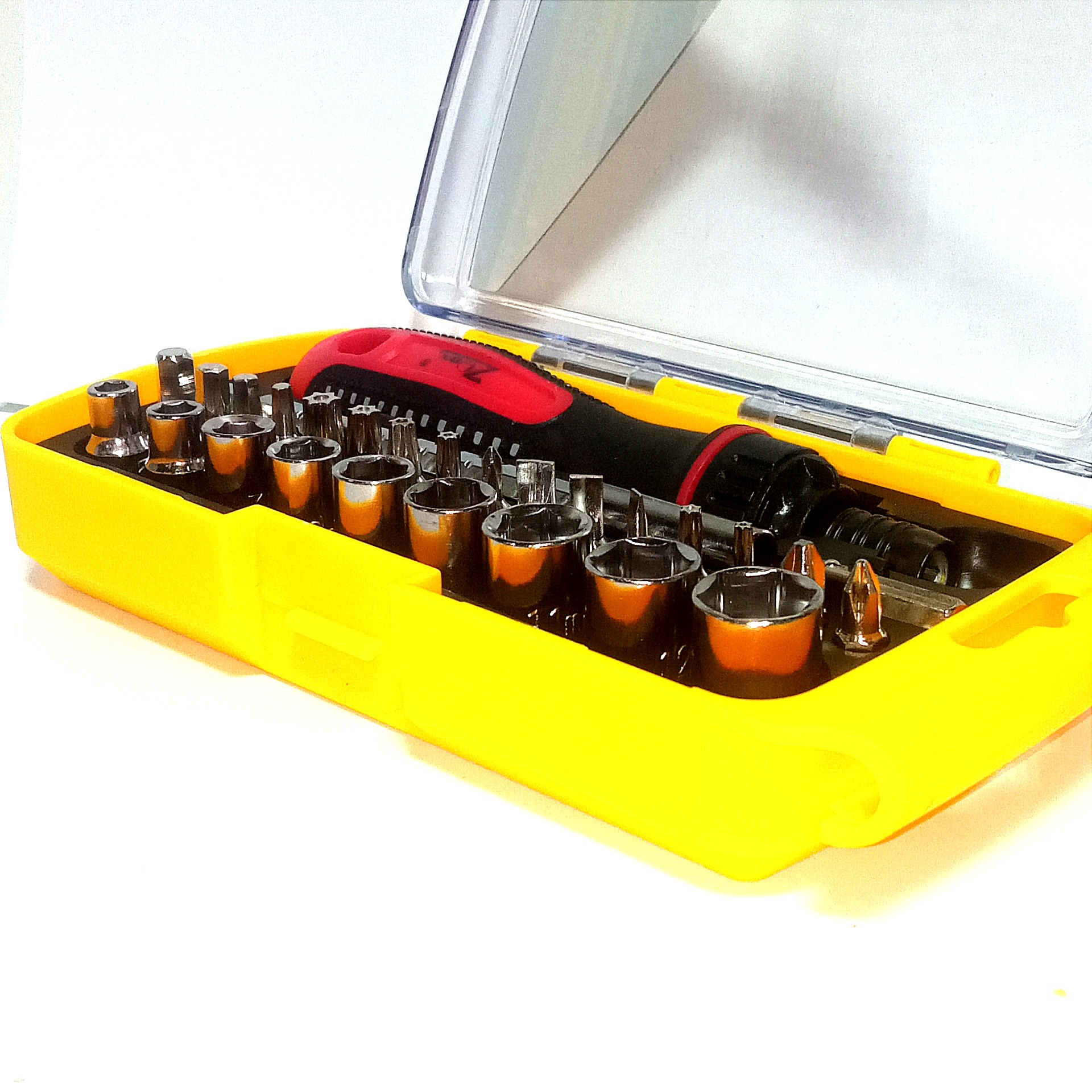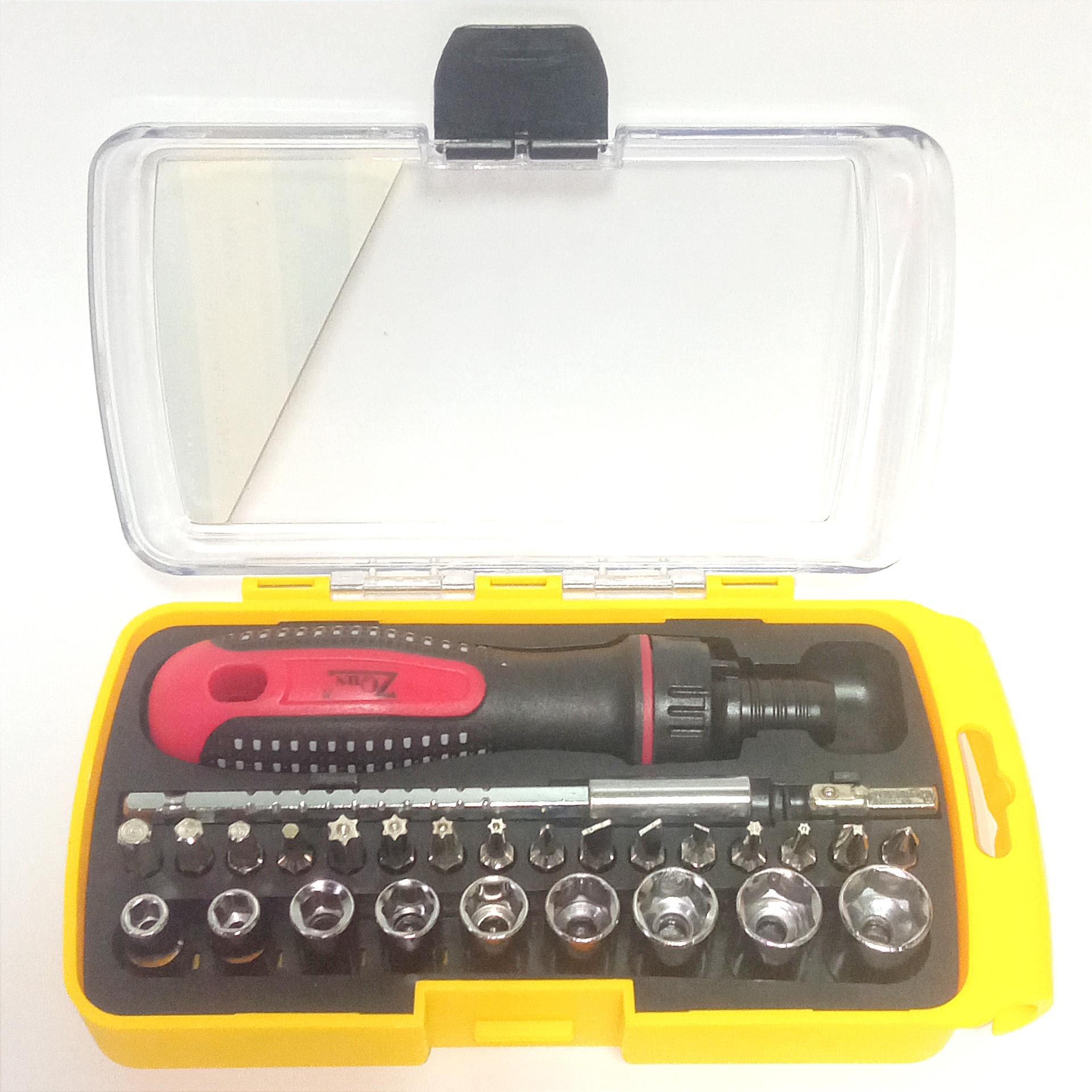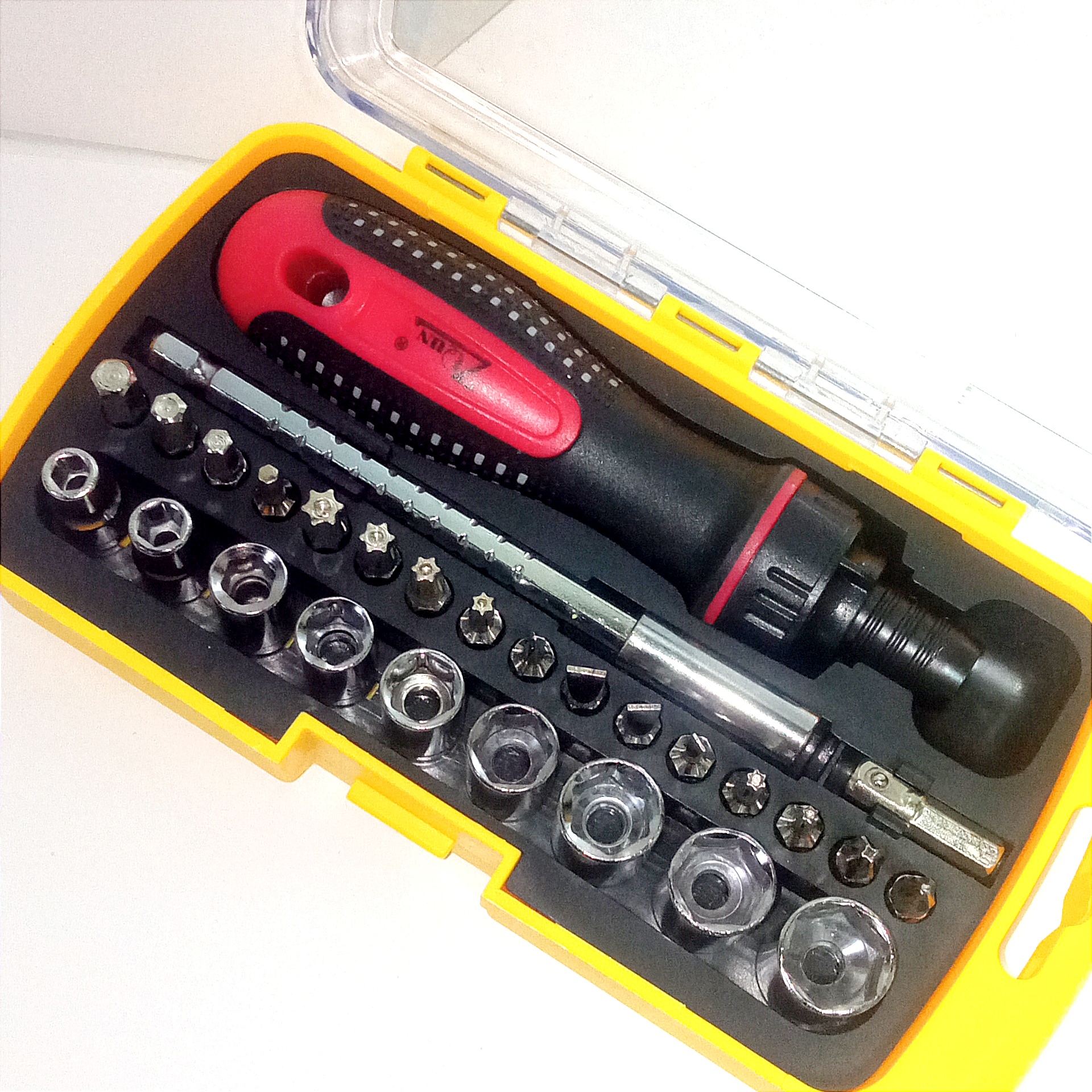 Набор компактно упакован, в него входит магнитная рукоятка отвёртки и 27 съемных насадок.