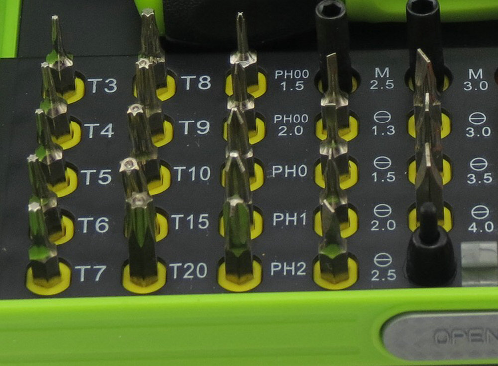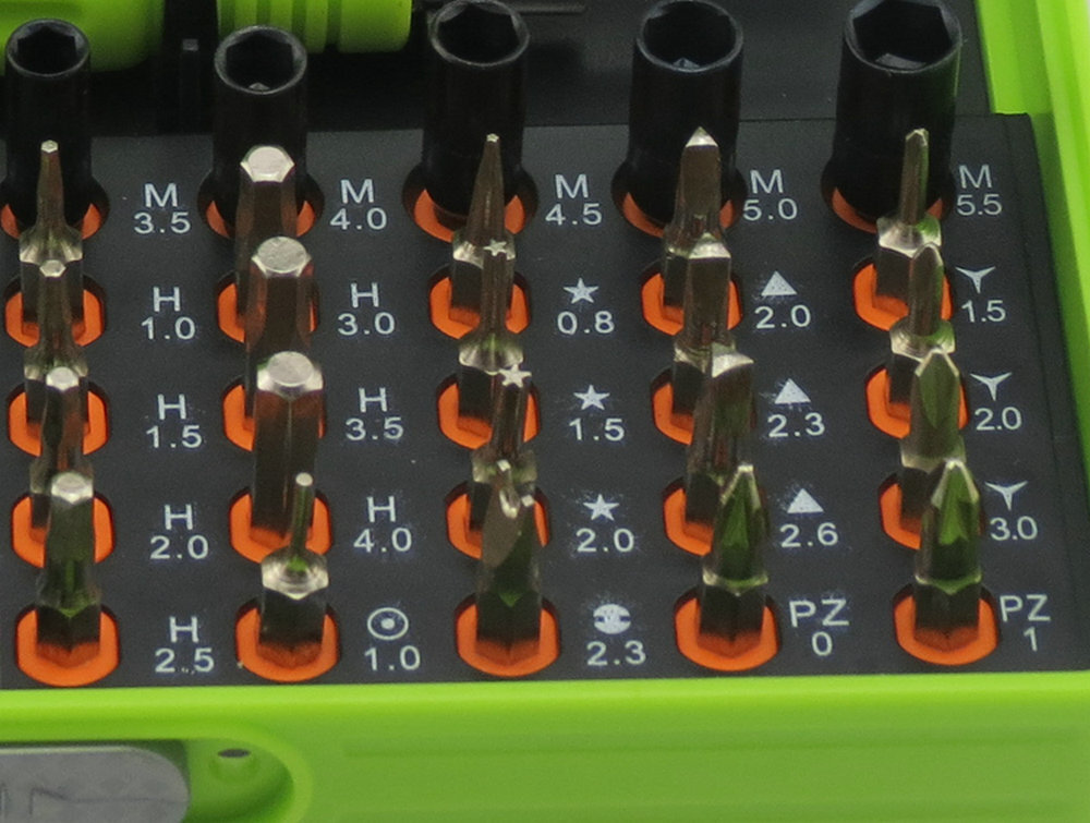 Рукав 7: M2.5, M3.0, M3.5, M4.0, M4.5, M5.0, M5.5. Слива 10: T3, T4, T5, T6, T7, (перфорированные: T8, T9, T10, T15, T20). Крест 5: PH000 (1,5) PH00 (2,0), PH0, PH1, PH2. Прямой 7: 1,3, 1,5, 2,0, 2,5, 2,5, 3,0, 3,5, 4,0. Шестигранник 7: H1.0, H1.5, H2.0, H2.5, H3.0, H3.5, H4.0.Пять звезд 3: 0,8, 1,5, 2,0. Треугольник 3: 2,0, 2,3, 2,6. Y-3: 1,5, 2,0, 3,0. Round1: 1,0.U-1: U2.3.PZ0.PZ1.