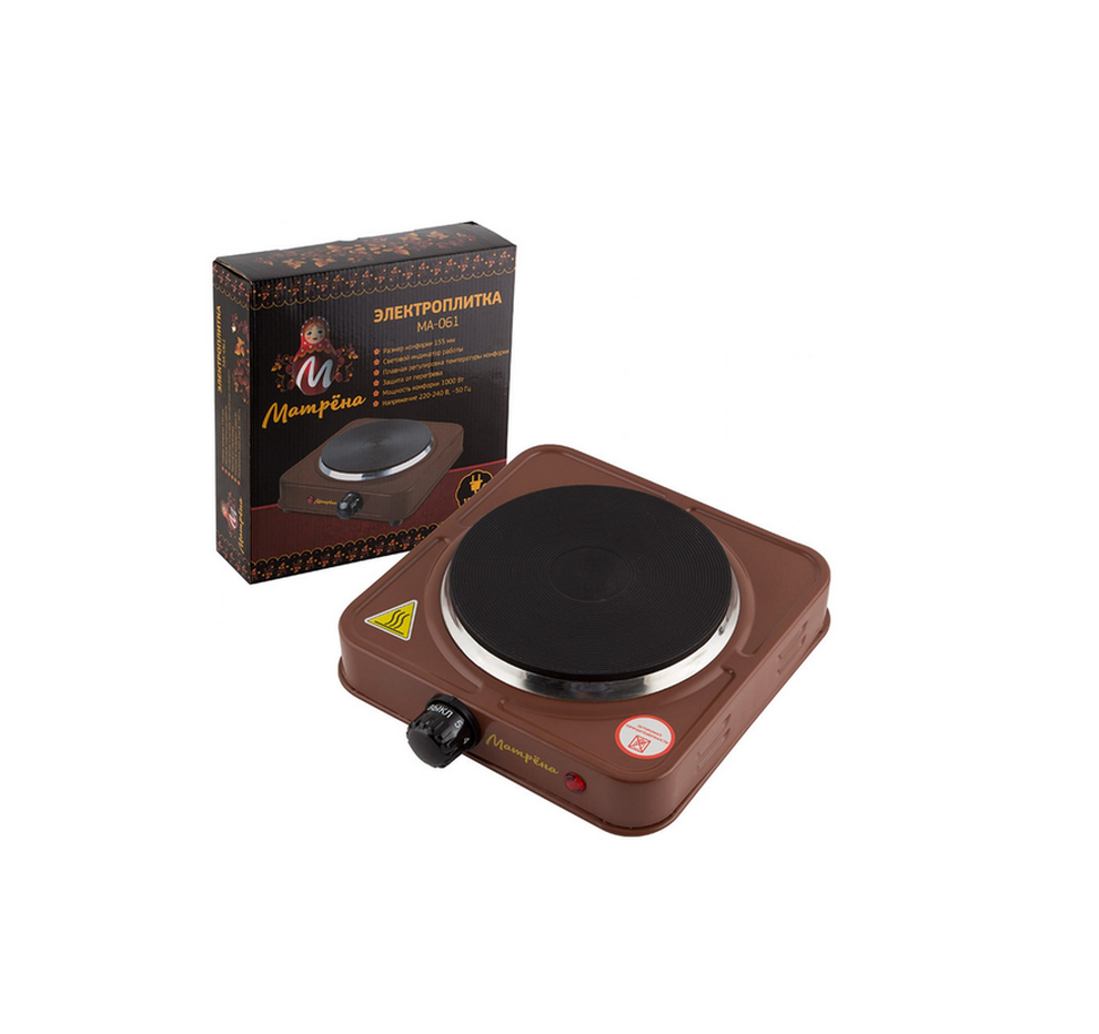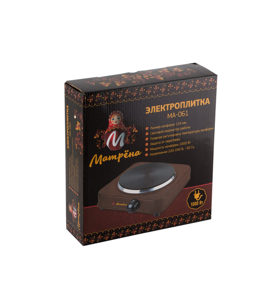 Настольная плитка Матрёна МА-061 Электроплитка на 1 конфорку. Размер конфорки 155 мм Световой индикатор работы Плавная регулировка температуры конфорки 5 режимов нагрева. Защита от перегрева Мощность конфорки 1000 Вт Напряжение 220в/50гц Материал корпуса- металл. Комплект: Плитка-1шт. Упаковка.