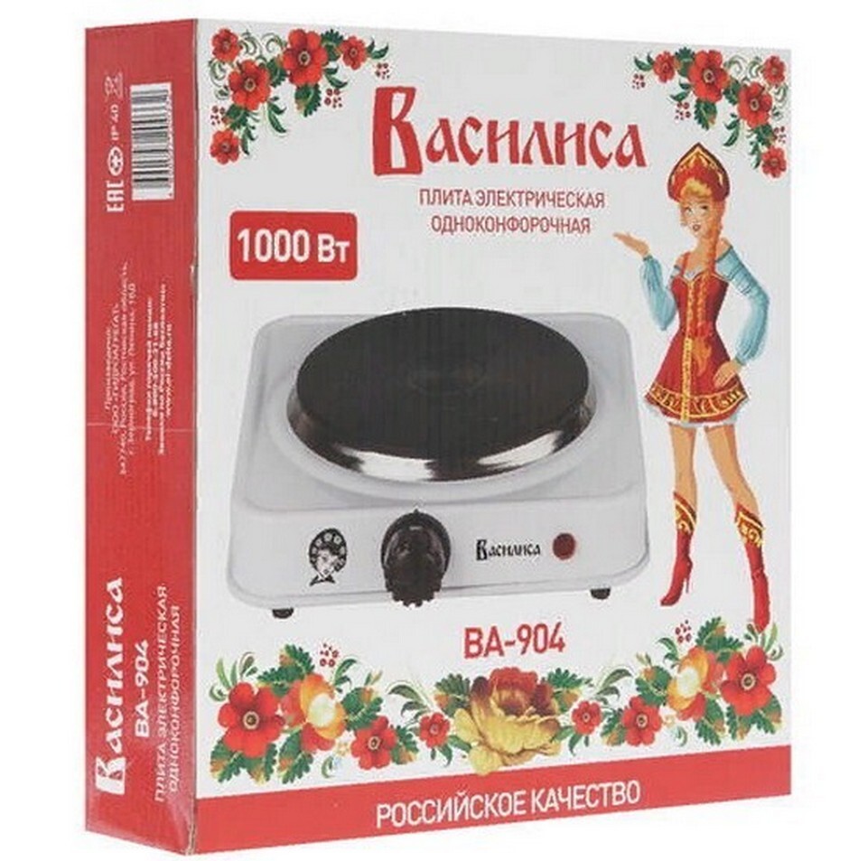 Настольная плитка Василиса ВА-904 однокомфорочная электрическая настольная плитка не заменимый помощник на кухне. Параметры: Номинальная потребляемая мощность 1000 Вт Количество конфорок 1 штука Вид конфорок - диск Эмалированная рабочая поверхность Поворотный механический переключатель Световой индикатор работы Терморегулятор Комплект: Плитка-1шт. Упаковка: цветная коробка