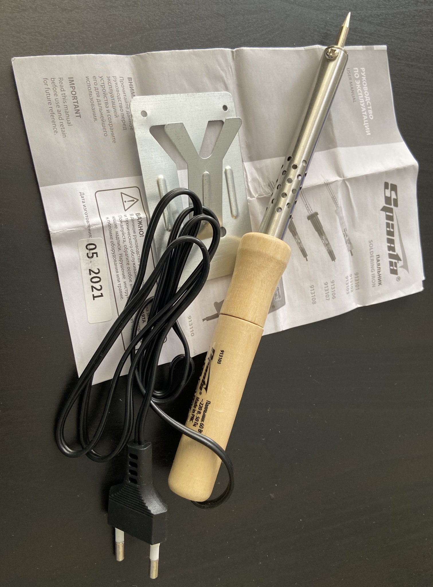 Электропаяльник Sparta 913103 является мощным инструментом, который справится с ремонтом в домашних условиях практически любых элементов радиодеталей. Паяльник обладает мощностью 60 Вт, при которой инструмент разогревается до 430°C. Инструмент является надежным и отлично исполняет свои обязанности. Форма паяльника выполнена в прямом виде, что позволяет использовать устройство под любым удобным углом. Ручка паяльника выполнена из дерева, что не позволит ей нагреваться даже при длительном использовании. Инструмент является электрическим, то есть источником питания устройства является электрическая сеть 220 В, к которой паяльник присоединяется проводом с резиновой оплеткой, длина которого составляет 1 метр. Корпус нагревательного элемента изготовлен из стального материала, а сам нагревательный элемент является нихромовая спираль. Жало устройства выполнено в прямой форме в виде конуса с острым наконечником. Жало изготовлено из медного материала с легированным покрытием.