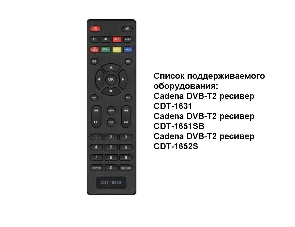 Пульт для Cadena CDT-1652SB/HOB1218 Huayu Cписок поддерживаемого оборудования: Cadena DVB-T2 ресивер CDT-1631 Cadena DVB-T2 ресивер CDT-1651SB Cadena DVB-T2 ресивер CDT-1652S