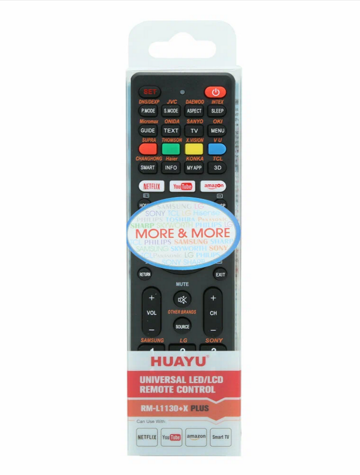 Универсальный пульт HUAYU RM-L1130+X PLUS собрал в себе многие марки как известных брендов, так и малоизвестныx. К пульту прилагается инструкция на русском языке с фотографиями оригинальных пультов. Настройка пульта очень простая и не займет у Вас много времени. При замене батареек, пульт сохраняет настройку на ваш телевизор. Этот пульт подходит к моделям: