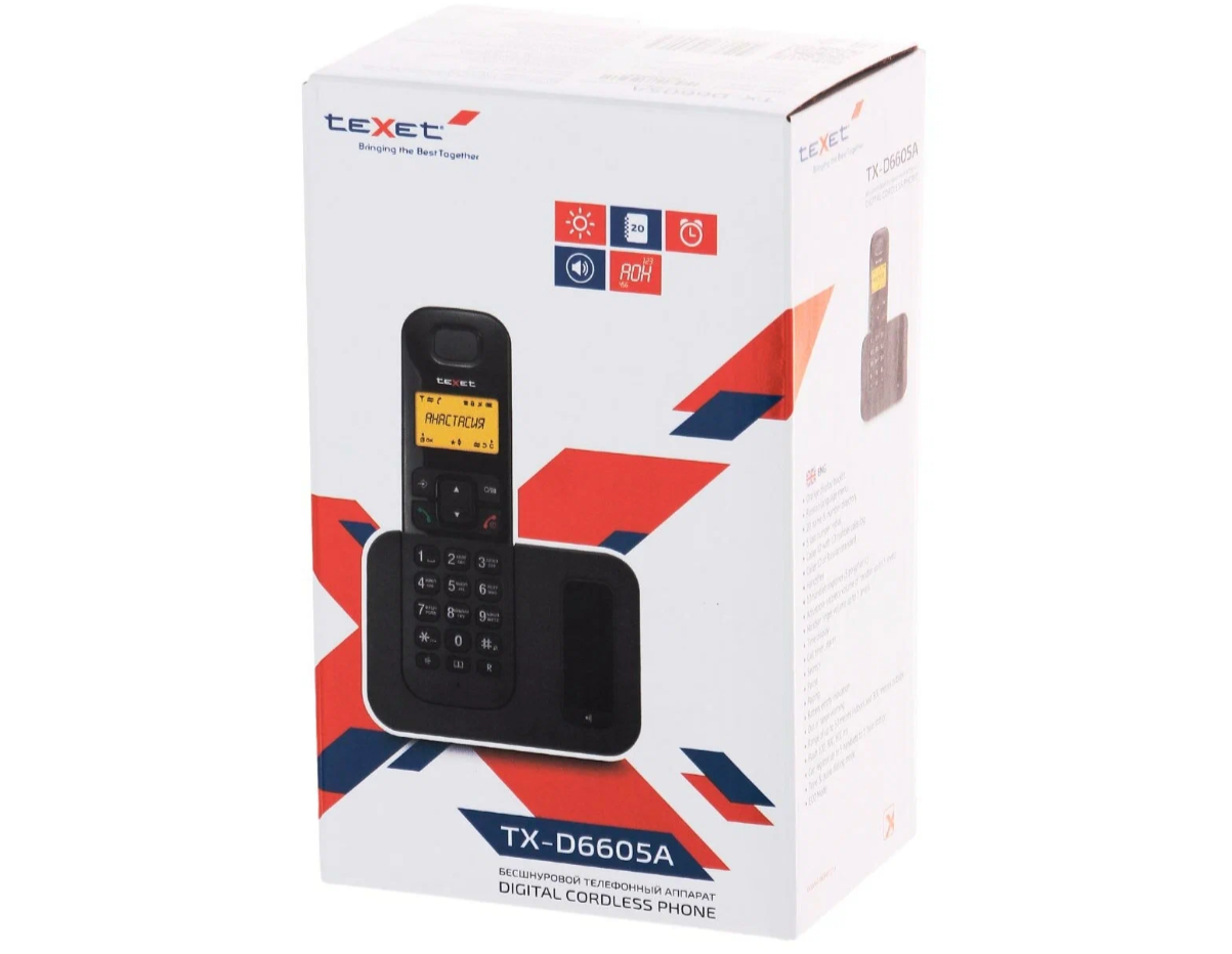 Традиционно для телефонов teXet аппарат имеет отличные эргономические показатели. Аналогичный прием сочетания матовой и глянцевой поверхностей используется в оформлении трубки: дисплей обрамлен пластиком super gloss, а корпус изготовлен из шероховатого материала, который обеспечивает уверенное удержание телефона в руке. Прорезиненные кнопки teXet TX-D6605A мгновенно отзываются при нажатии. Дисплей новинки оснащен ярко-оранжевой подсветкой, за счет чего информационные символы легко различимы на контрастном фоне.