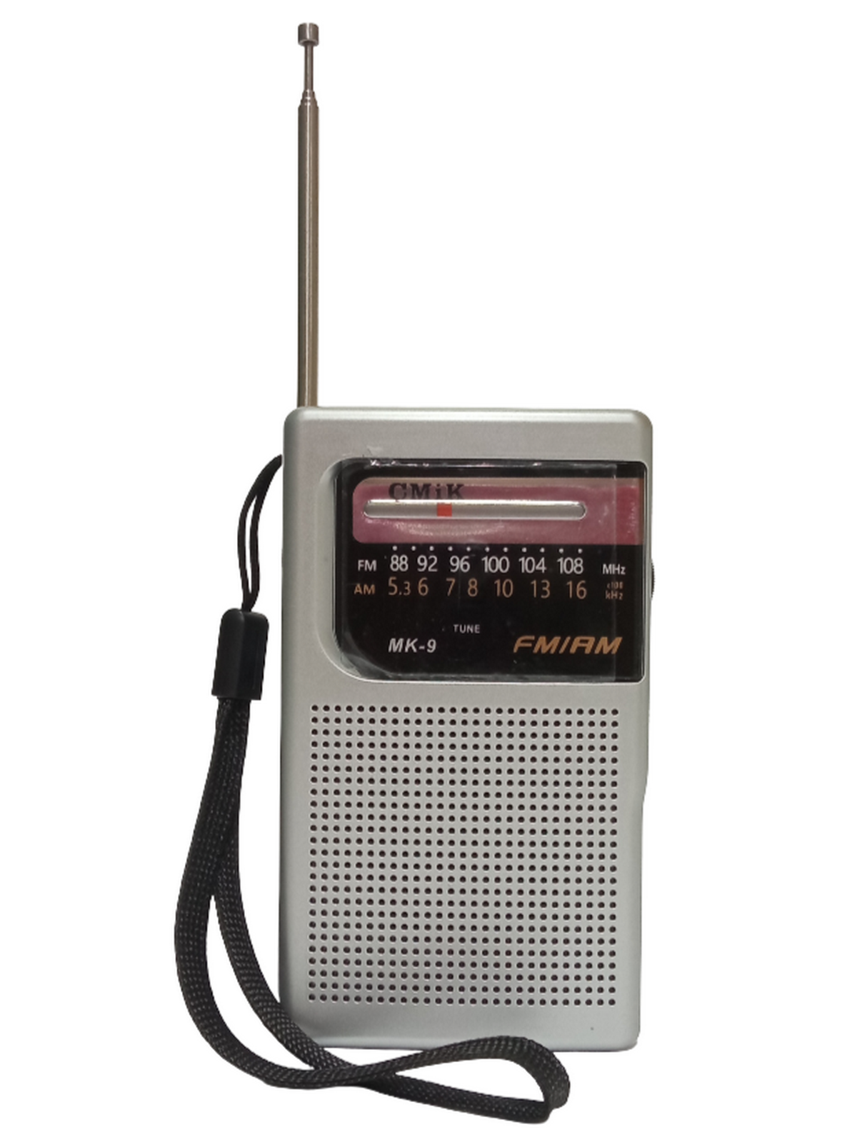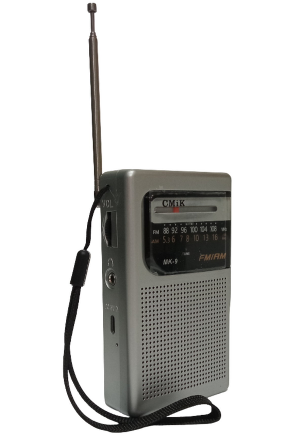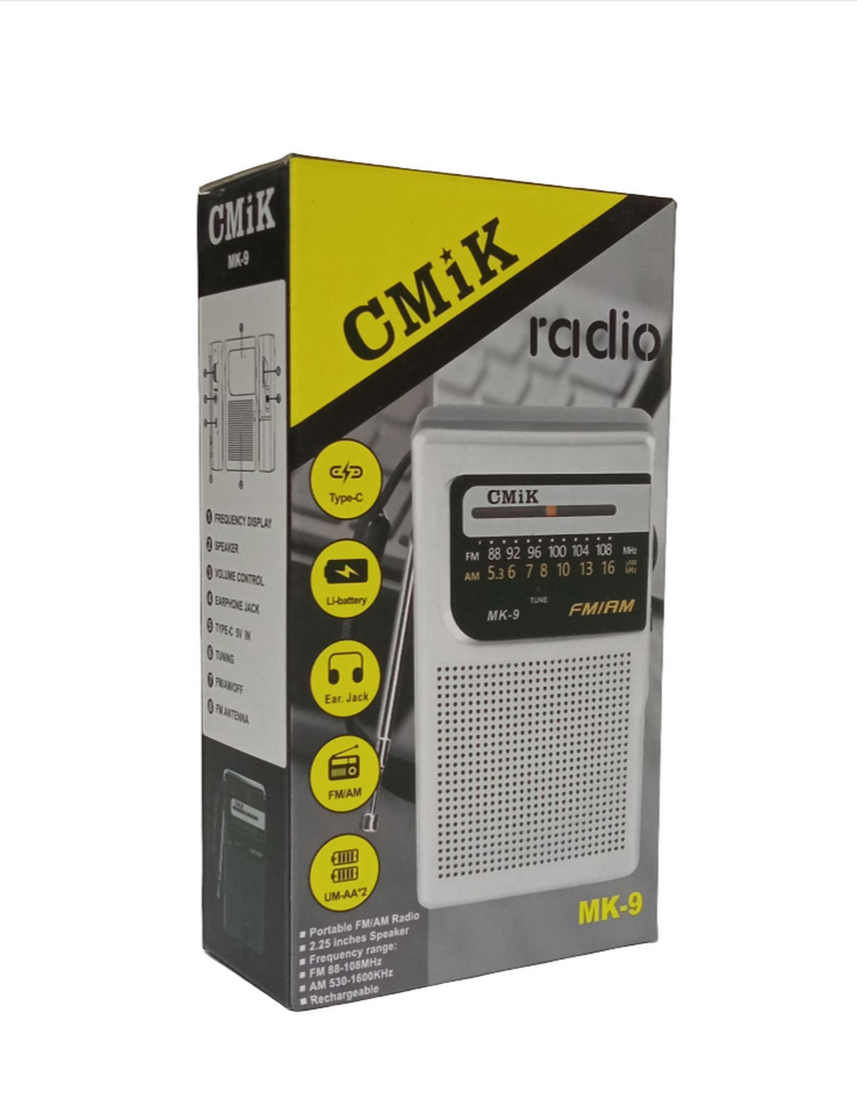 Карманный аккумуляторный радиоприёмник CmiK MK‑9 — компактное и удобное устройство для прослушивания радио в любом месте. Оснащён встроенным аккумулятором, обеспечивающим длительную автономную работу; поддерживает диапазоны FM и AM, гарантирует чёткий приём сигналов даже в условиях слабого покрытия. Имеет эргономичный корпус с интуитивно понятными кнопками управления, встроенный динамик с чистым звучанием и разъём для наушников. Предусмотрена телескопическая антенна для улучшения качества приёма.