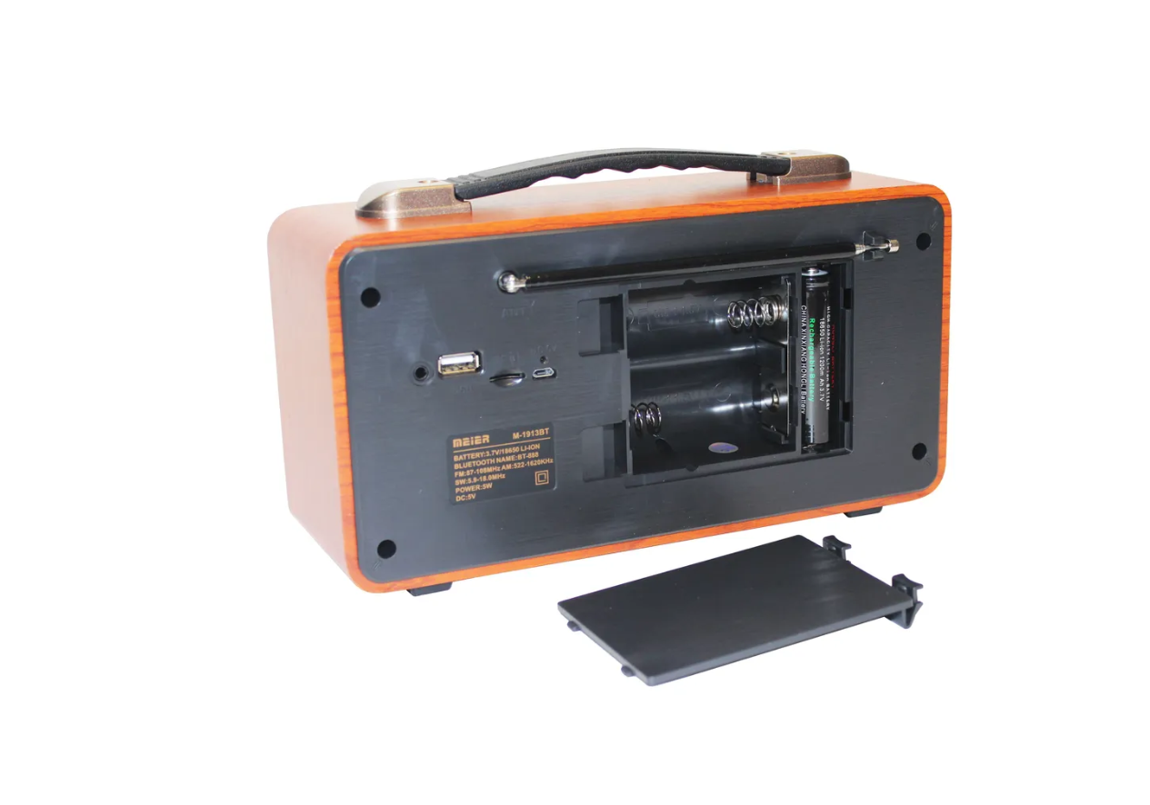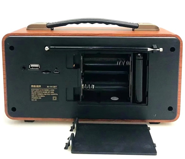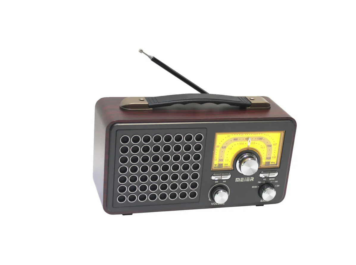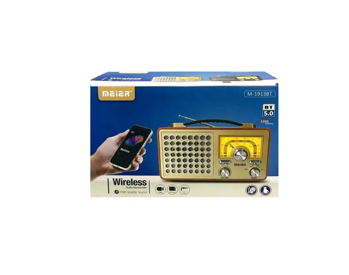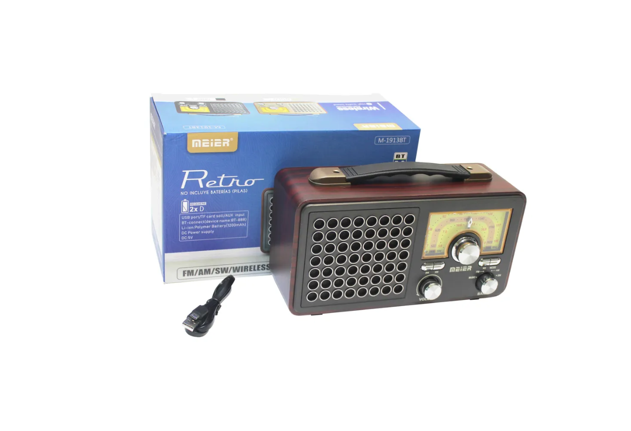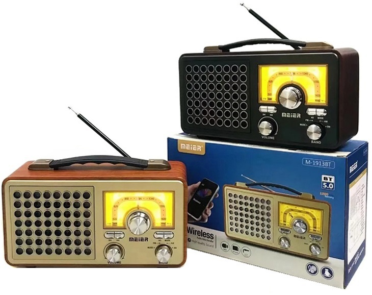 Радиоприемник Meier M-1912-BT для приема всех радио частот и воспроизведения музыки, имеет высокое качество звука. Система предназначена для приема всех радио частот и воспроизведения музыки, имеет высокое качество звука. Meier M-1913-BT – современное устройство для прослушивания радиопередач и музыки в ретро-дизайне. Корпус модели повторяет первые модели радиоприемников и легко впишется в любой интерьер. Радиоприемник поддерживает воспроизведение музыки с накопителей USB и карт памяти. В нем есть модуль Bluetooth для подключения и управления со смартфона. Устройство работает от встроенного аккумулятора или батареек (2 х R20), поэтому его можно захватить с собой на отдых на свежем воздухе или взять на дачу. Также возможно подключение к стационарной электросети через адаптер. Bluetooth 5.0. Мощность: 5 Вт. Воспроизведение музыки файлов MP3 c USB флеш накопителя и TF карт AUX (гнездо для наушников). Перезаряжаемый аккумулятор 1200 mAh - в комплекте. Подсветка шкалы тюнера.FM/ AM/SW. Кабель зарядки в комплекте.