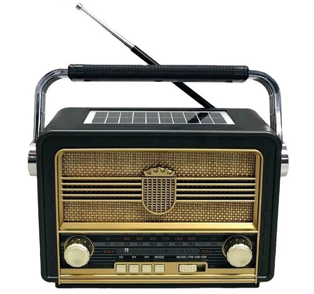Радиоприемник Meier M-528BT-S USB (солнечная панель) Ретро радио приемник с функцией блютуз и MP3 плеером.. Радиоприемник может проигрывать файл с USB флешки и TF карт. Данное устройство имеет сменный аккумулятор (18650) заряжающийся USB кабелем а так же есть возможность подзарядки от солнечной энергии. Ретро радио может проигрывать файл через блютуз выступая в роли беспроводной колонки.Солнечная батарея для питания в полевых условиях .Аналоговая регулировка громкостПоддержка USB / МР3 / TF карт для при и радиоволн Съемный перезаряжаемый аккумулятор Встроенный мощный динамик с хорошим звучанием AUX гнездо DC: 5V USB кабель для зарядки в комплекте Питание от батареек D 2 шт (в комплект не входят) Размер приемника: 20х11.5х5 Комплект: Радиоприемник-1шт. Шнур зарядки-1шт.Аккумулятор (18650)-1200Mah-1шт. Упаковка