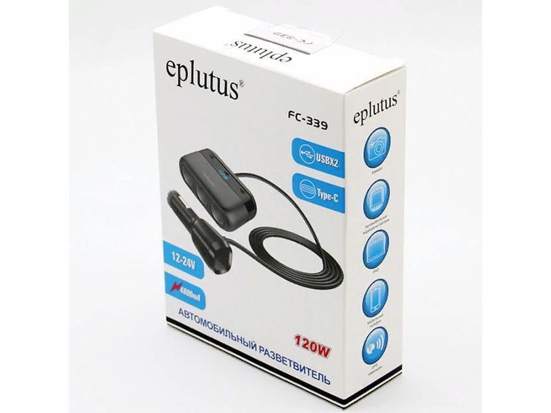 Автомобильный разветвитель прикуривателя Eplutus FC-339 на 120 Ватт с двумя USB и Type-C(USBx2/3Sockets+TypeC) вольтметр Разветвитель на 3 розетки,2 USB и Type-C 2 разъема USB 5В/4.8А (2.4А+2.4А) Type-C выход 5В/1А Суммарная мощность 120Вт Мощность токо потребления до 10А Подключение до 6 устройств одновременно LED дисплей Вход-выход DС12-24V Длина кабеля 80 см. Компдектация: Автомобильный разветвитель 1шт. Упаковка