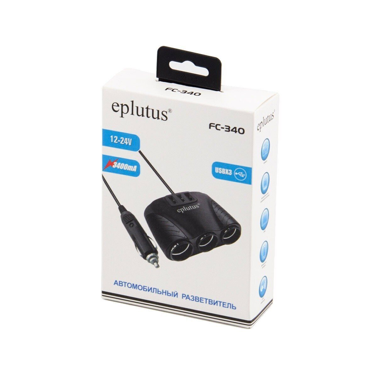Автомобильный разветвитель прикуривателя модели Eplutus FC-340 позволяет одновременно запитывать до 6-ти электронных гаджетов общей мощностью не более 120Вт, подключая их к собственной электросети автомобиля (12-24В DC). Устройство оснащено тремя выходными розетками, аналогичными разъему авто-прикуривателя и тремя 5-вольтовыми USB разъемами.
