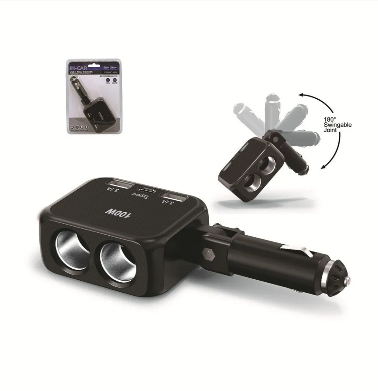 Разветвитель авто IN‑CAR 1655 (2 USB + Type‑C / 2 розетки) — удобное устройство для одновременного подключения нескольких гаджетов в автомобиле; оснащён двумя стандартными розетками прикуривателя и тремя зарядными портами (2 USB и 1 USB Type‑C), поддерживает общую мощность до 100 Вт, работает с бортовыми сетями 12–24 В; имеет защиту от короткого замыкания, перегрузки и перепадов напряжения; компактный эргономичный корпус легко устанавливается в гнездо прикуривателя, поворот на 180° позволяет удобно расположить кабели; светодиодная подсветка облегчает использование в тёмное время суток; подходит для зарядки смартфонов, планшетов, питания видеорегистраторов, навигаторов и других автомобильных устройств.