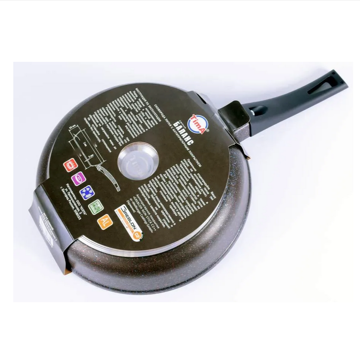 Сковороды российского производителя посуды TimA серии Баланс имеют прочное, надёжное антипригарное покрытие Greblon non-stick C2+ от Weilburger Coatings GmbH (Германия). Покрытие экологически безопасно, т.к. не содержит PFOA (перфтороктановую кислоту). Высокий бортик в 6,5 см позволит не только жарить, но и тушить. За счёт такой высоты, по сути вы можете использовать сковороды серии Баланс также как и сотейники. Литое основание, утолщённое дно и стенки придают равномерный прогрев сковородкам этой серии.