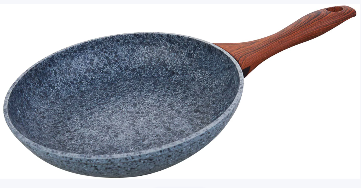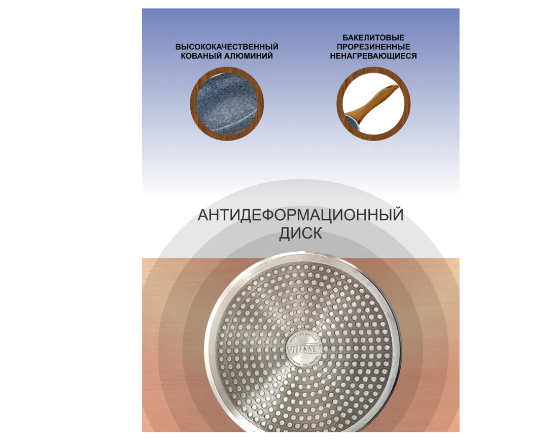 Сковорода Vitesse VS-4021 Granite изготовлена из кованого алюминия, ее толстые стенки и дно быстро прогреваются и хорошо держат температуру.