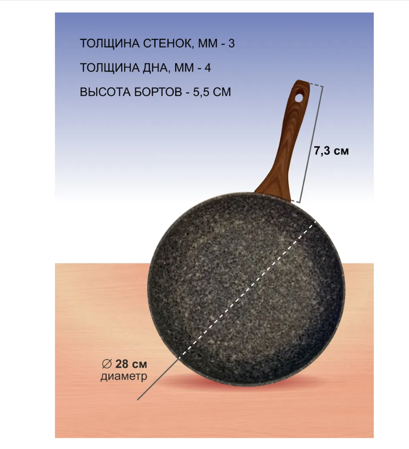 Ручки - бакелитовые прорезиненные не нагревающиеся. Можно мыть в посудомоечной машине - да. Диаметр, см - 28. Быстрый нагрев и равномерное распределение тепла по всей поверхности. Нагрев: газовые конфорки чугунные конфорки стеклокерамические конфорки галогеновые конфорки индукционные конфорки электрические конфорки. Толщина стенки (мм): 4.