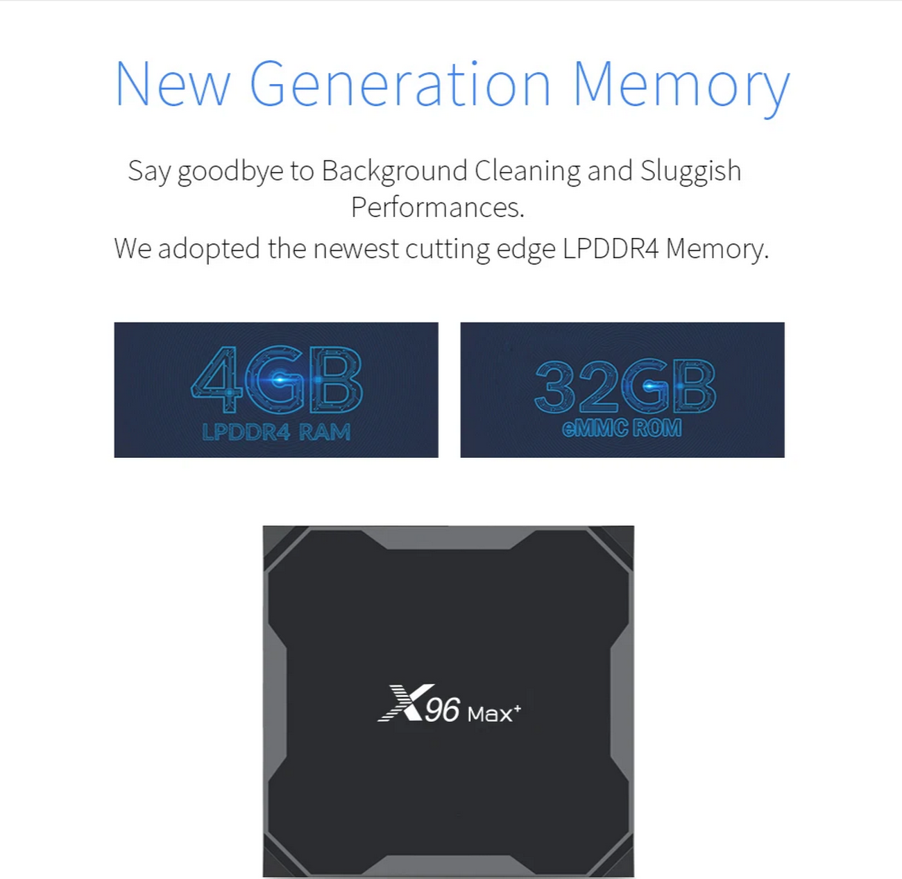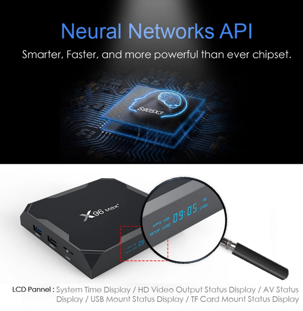 Смарт‑приставка Smart TV Box X96Max+ на базе Android — универсальное решение для превращения обычного телевизора в полноценный Smart TV. Устройство оснащено 4 ГБ оперативной и 32 ГБ встроенной памяти, четырёхъядерным процессором Amlogic S905X3 (до 1,91 ГГц) и графическим ускорителем Mali‑G31 MP2, обеспечивает плавное воспроизведение видео в разрешении 4K 60 fps с поддержкой современных кодеков (H.265, VP9). Подключение к сети — через Wi‑Fi (2,4/5 ГГц) или LAN‑порт (100 Мбит/с), есть Bluetooth 4.1 для беспроводных аксессуаров.