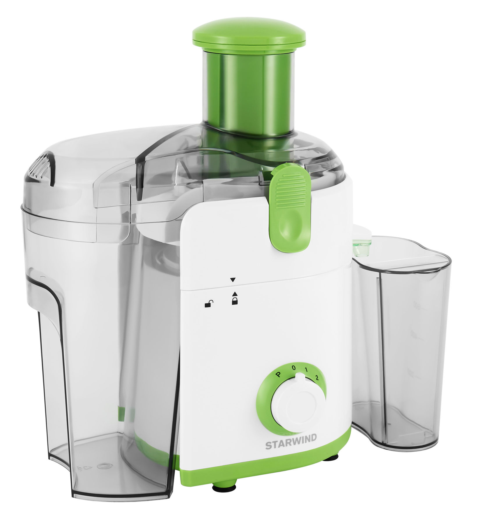 Для сока и мякоти в устройстве предусмотрено две отдельные тары, первый резервуар имеет объём 800 мл, второй – 1000 мл. 2 режима скоростей под разные овощи и фрукты. Устройство отличается тихим звуком при работе – всего в районе 80 дБ. Starwind SJ2216 сделана из нержавеющего пластика. Прорезиненные ножки.