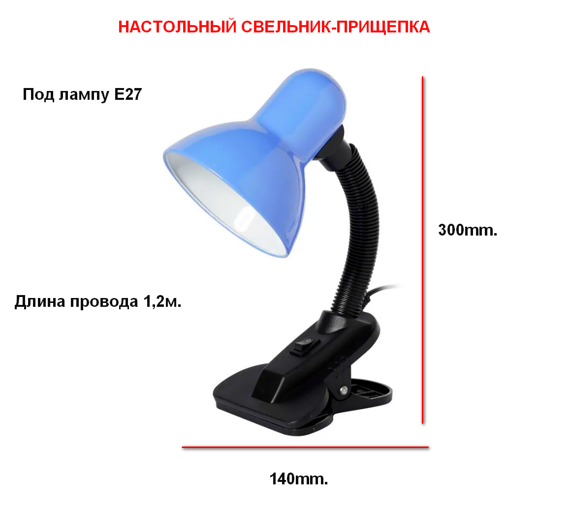 Обладает гибкой регулируемой ножкой и удобно расположенным выключателем на основании.Светильник Smartbuy SBL-DeskL01-Black настольный прищепка Технические характеристики, Максимальная мощность лампочки - 60 Вт, Патрон Е27 Материал корпуса металл+пластик Индивидуальная упаковка (пакет+стикер) Источники света ЛОН, Е27, в комплект не входит. Максимальная регулируемая высота -18см. Длина шнура-1м