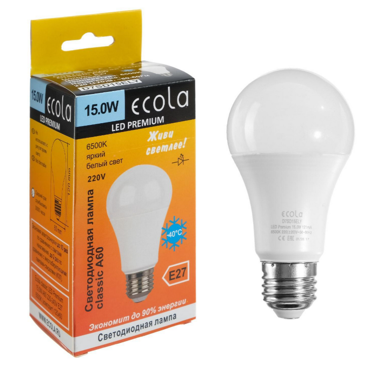 Светодиодная лампа ECOLA CLASSIC LED PREMIUM D7SD15ELY 15,0W A60 220-240V E27 6500K (композит) 120 x 60.