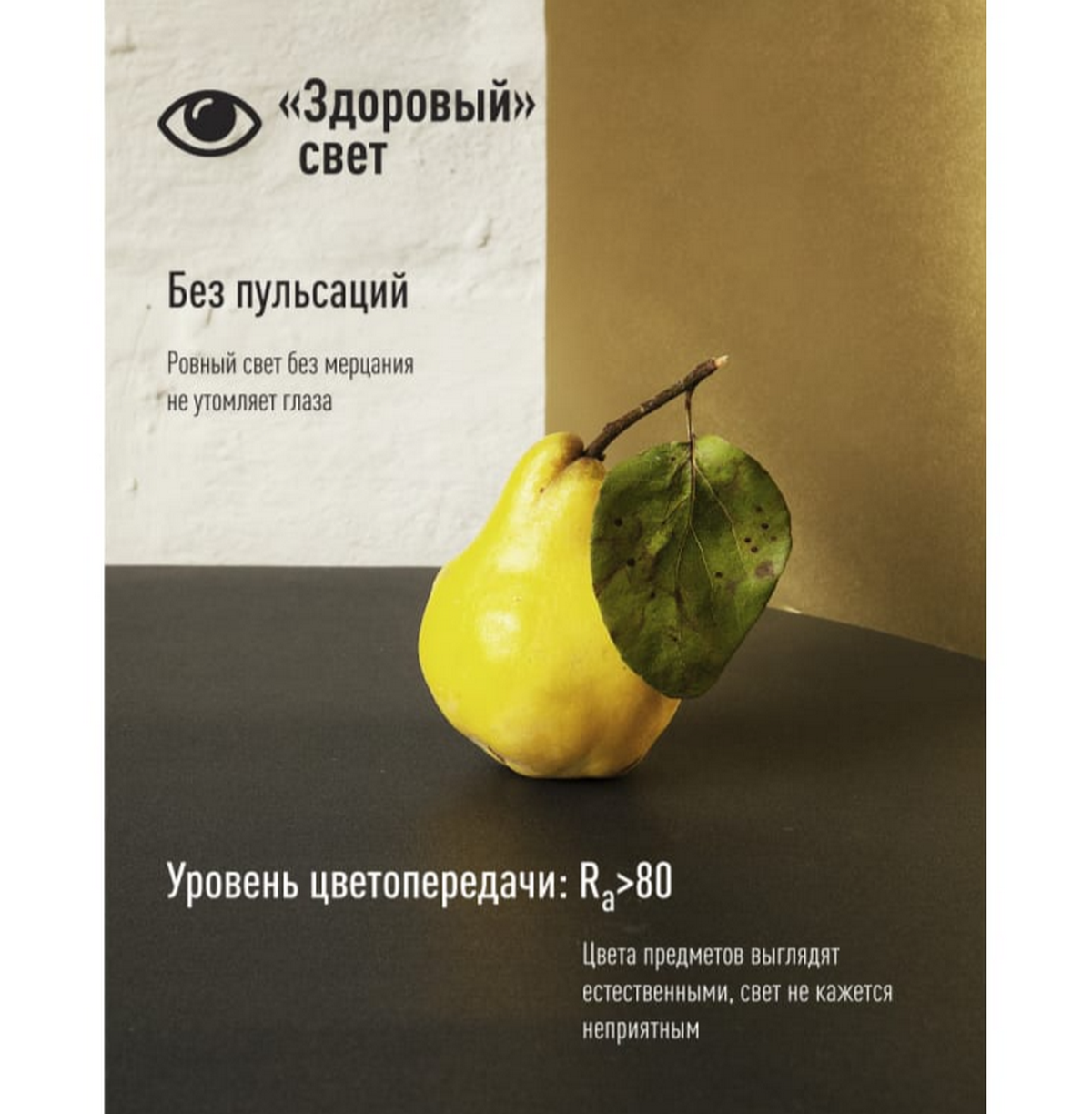 Ровный свет без пульсации и мерцания. Благодаря цветопередачи предметы выглядят натурально, свет не кажется неприятным.