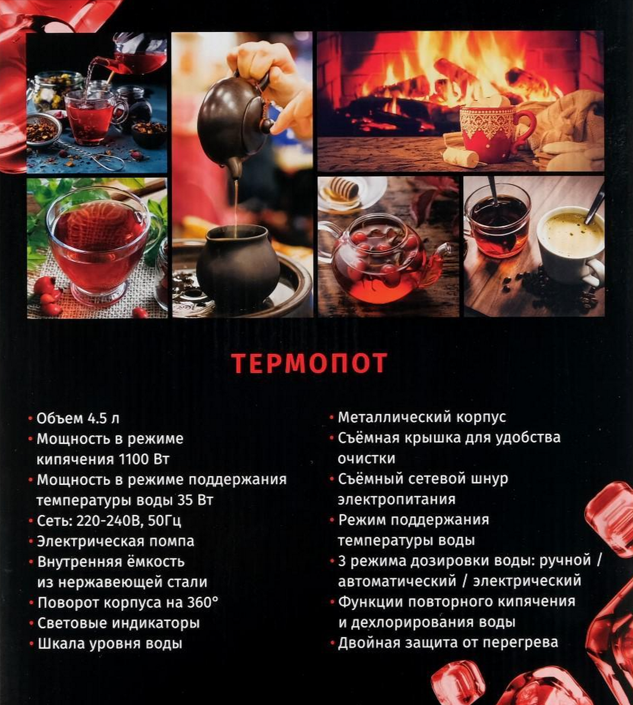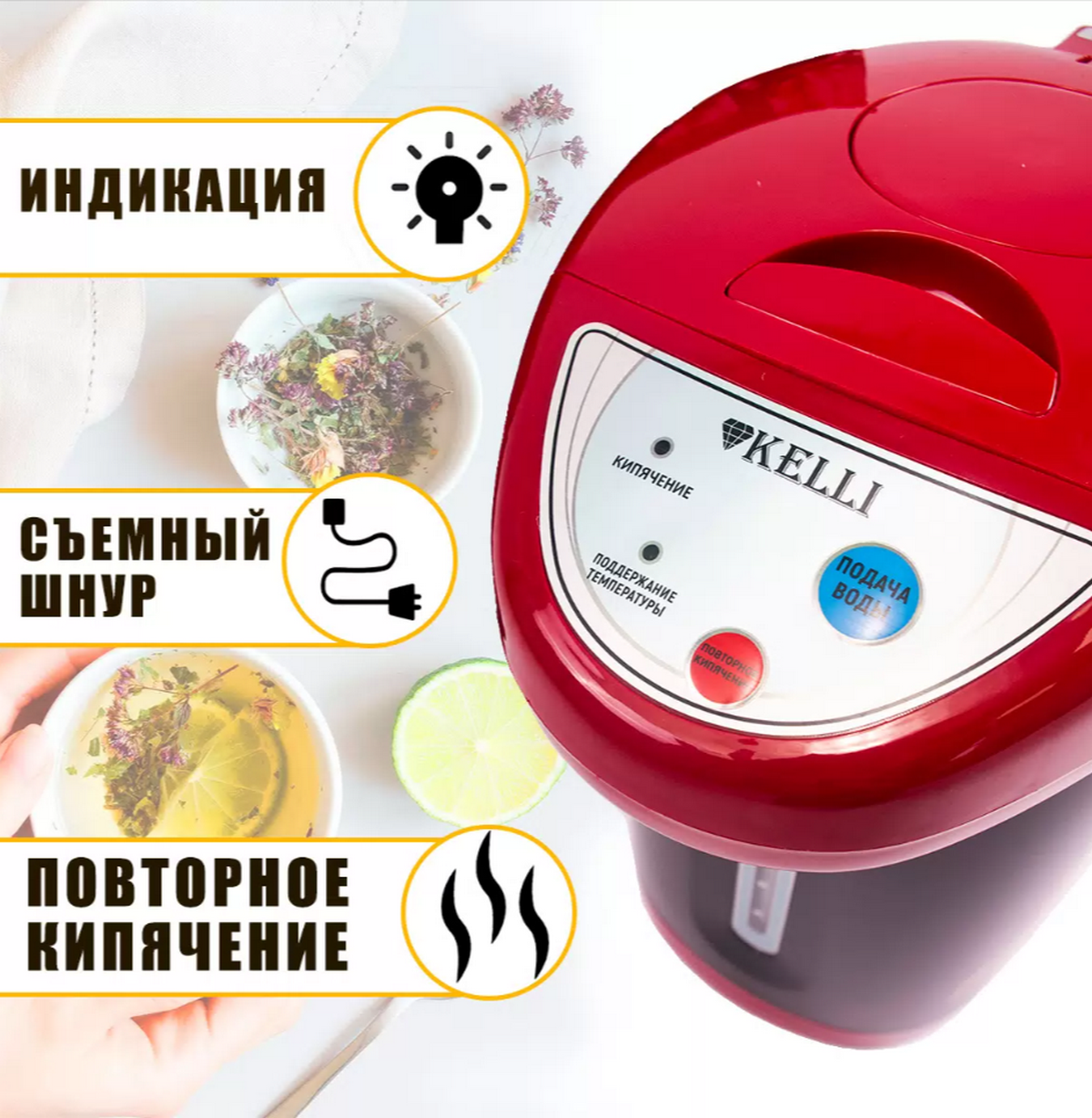 Термопот Kelli KL-1484 способен нагревать воду и сохранять ее температуру длительное время. Устройство оснащено закрытым нагревательным элементом, от обычного электрочайника отличается корпусом, выполненным из более прочного теплоизолированного материала. Термопот кипятит воду и поддерживает ее температуру на заданном уровне, не допуская повторного кипячения воды, что позволяет сохранить в ней все полезные вещества.