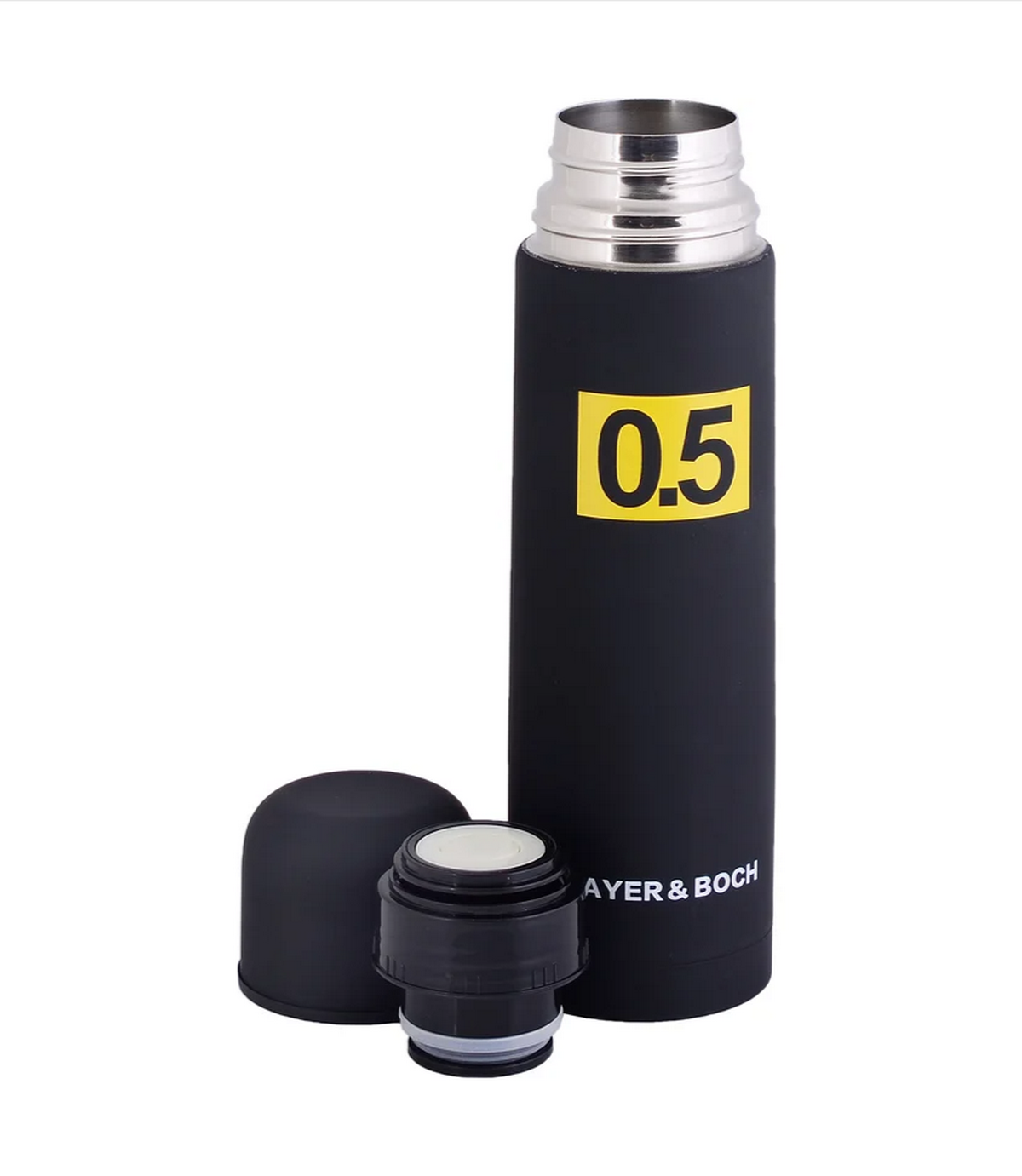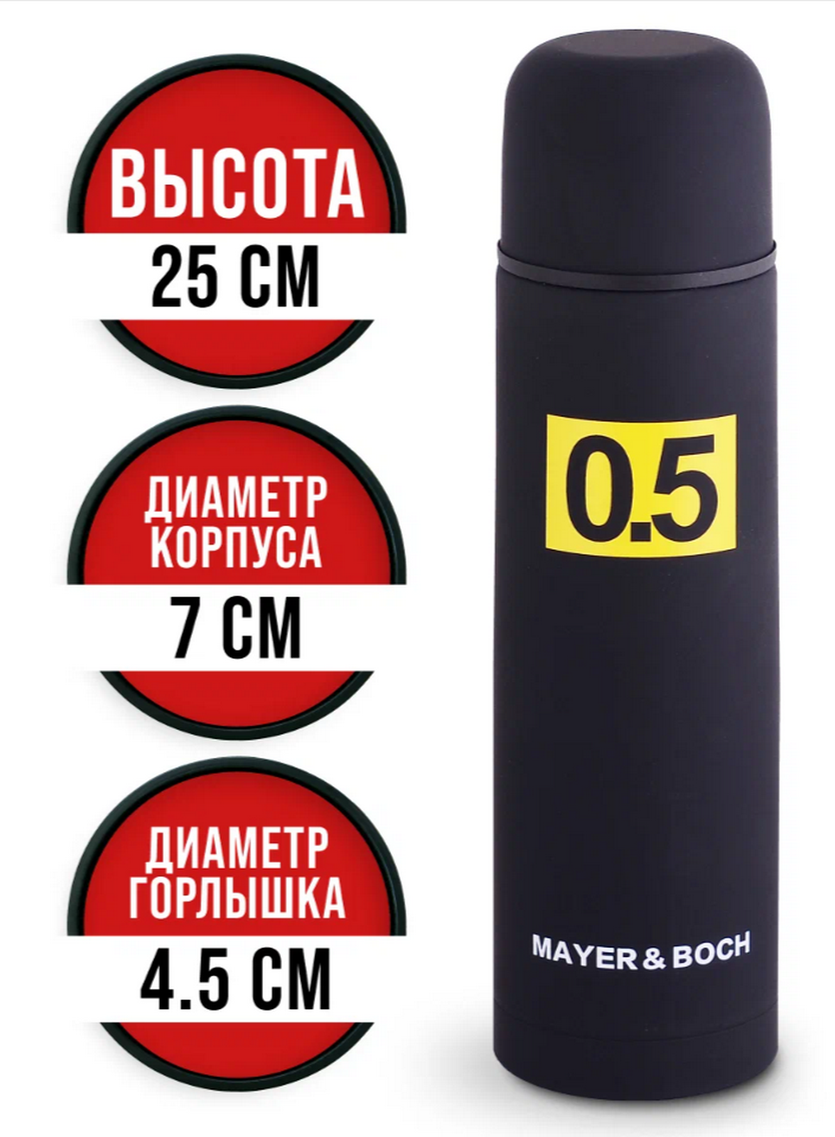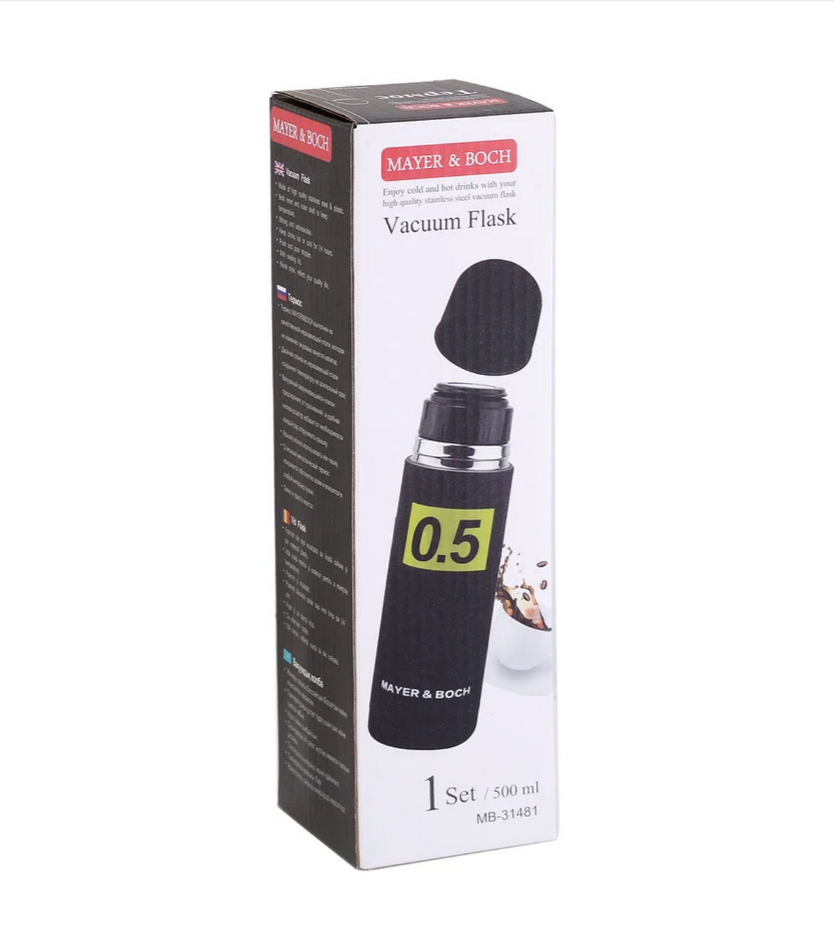 Термос MB‑31481 объёмом 0,5 л выполнен из высококачественной нержавеющей стали с двойной стенкой и вакуумной изоляцией, обеспечивающей сохранение температуры напитков до 24 часов; оснащён вакуумным закручивающимся клапаном с кнопкой для удобного наливания и крышкой‑чашкой объёмом 90 мл; компактные размеры (высота — 25 см, диаметр корпуса — 7 см) и малый вес (291 г) позволяют легко переносить термос в сумке; ударопрочная конструкция и надёжные материалы гарантируют долговечность, а лаконичный чёрный дизайн подходит для повседневного использования; термос легко и просто моется.