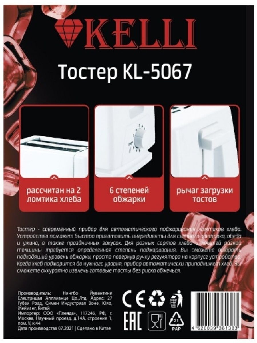 Тостер Kelli KL-5067 простой и удобный в использовании! Удобное механическое управление с плавной регулировкой степени поджаривания позволит с легкостью пользоваться этим тостером. Кнопка отмены позволяет в любой момент остановить приготовление тостов. Благодаря термоизоляции корпус тостера не нагревается, и к нему можно прикасаться. Индивидуальная настройка температурного режима для приготовления вкусных тостов позволит выбрать одну из 6 степеней обжаривания. Характеристики: Мощность: 1200Вт. Рассчитан на 2 ломтика хлеба. 6-ти позиционный термостат. Высокий подъем тостов. Автоцентрирование тостов. Кнопка принудительного выброса. Рычаг загрузки тостов. Съемный поддон для крошек. Термоизолированный корпус. Питание Сеть: 220-240В, 50Гц. Комплектация: Тостер-1шт. Упаковка.