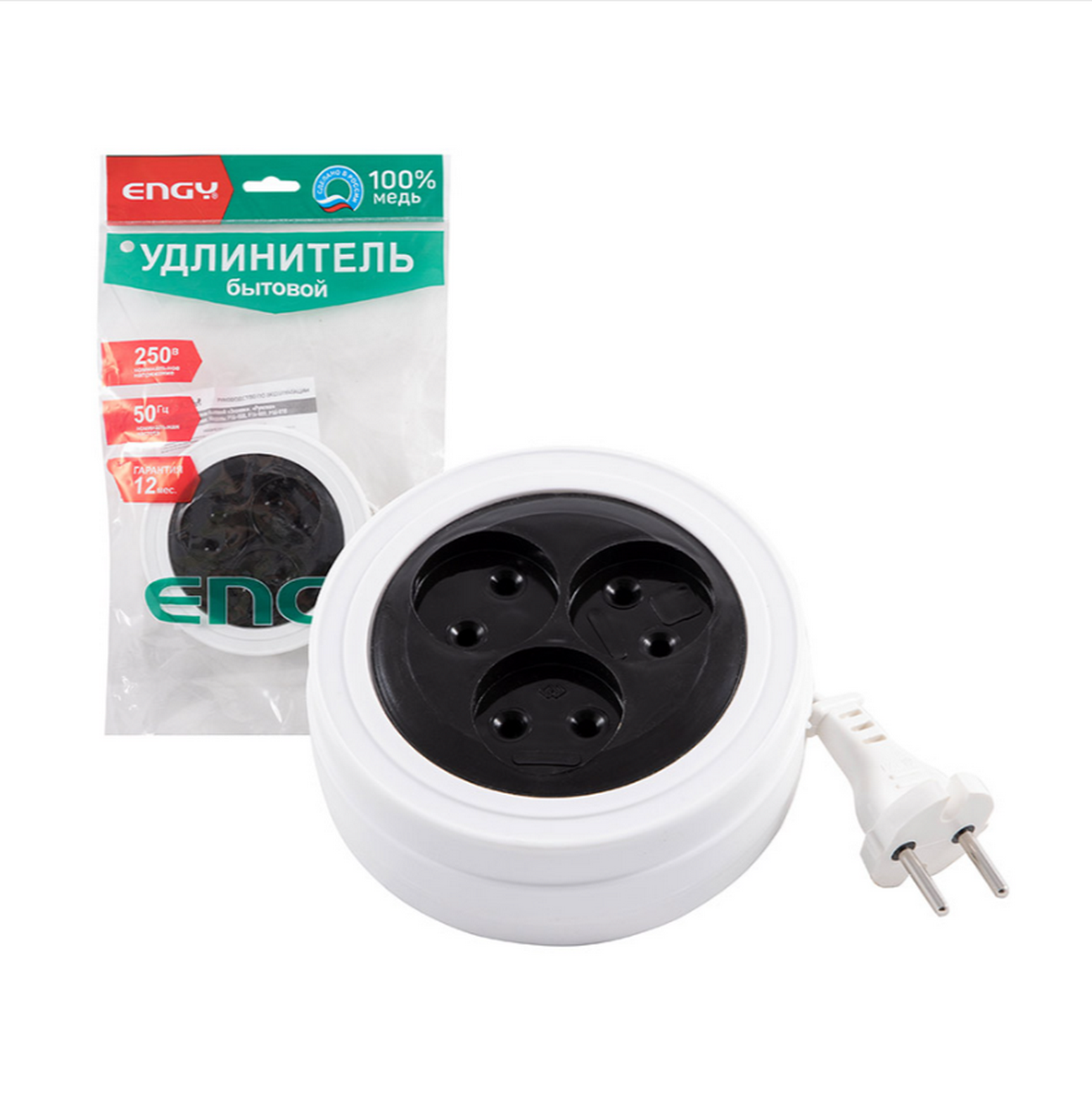 Удлинитель ENGY "Рулетка" 5 метров 3 розетки без заземления.